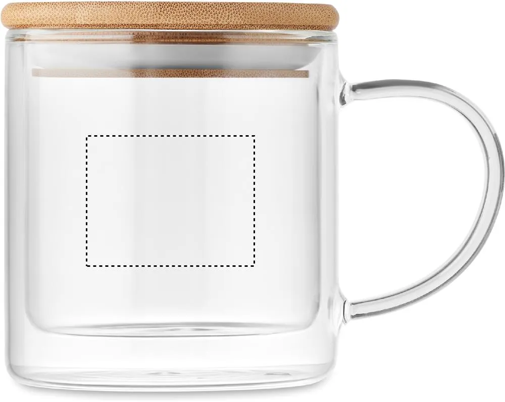 Caneca de vidro borossilicato de parede dupla com tampa de bambu e pegas coloridas. Capacidade: 300 ml.Caneca borosilicato 300 ml