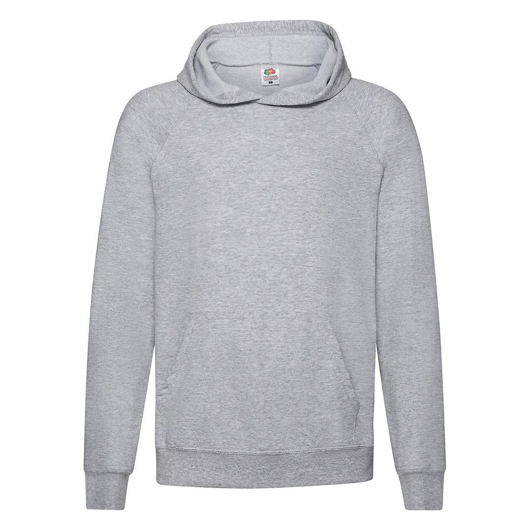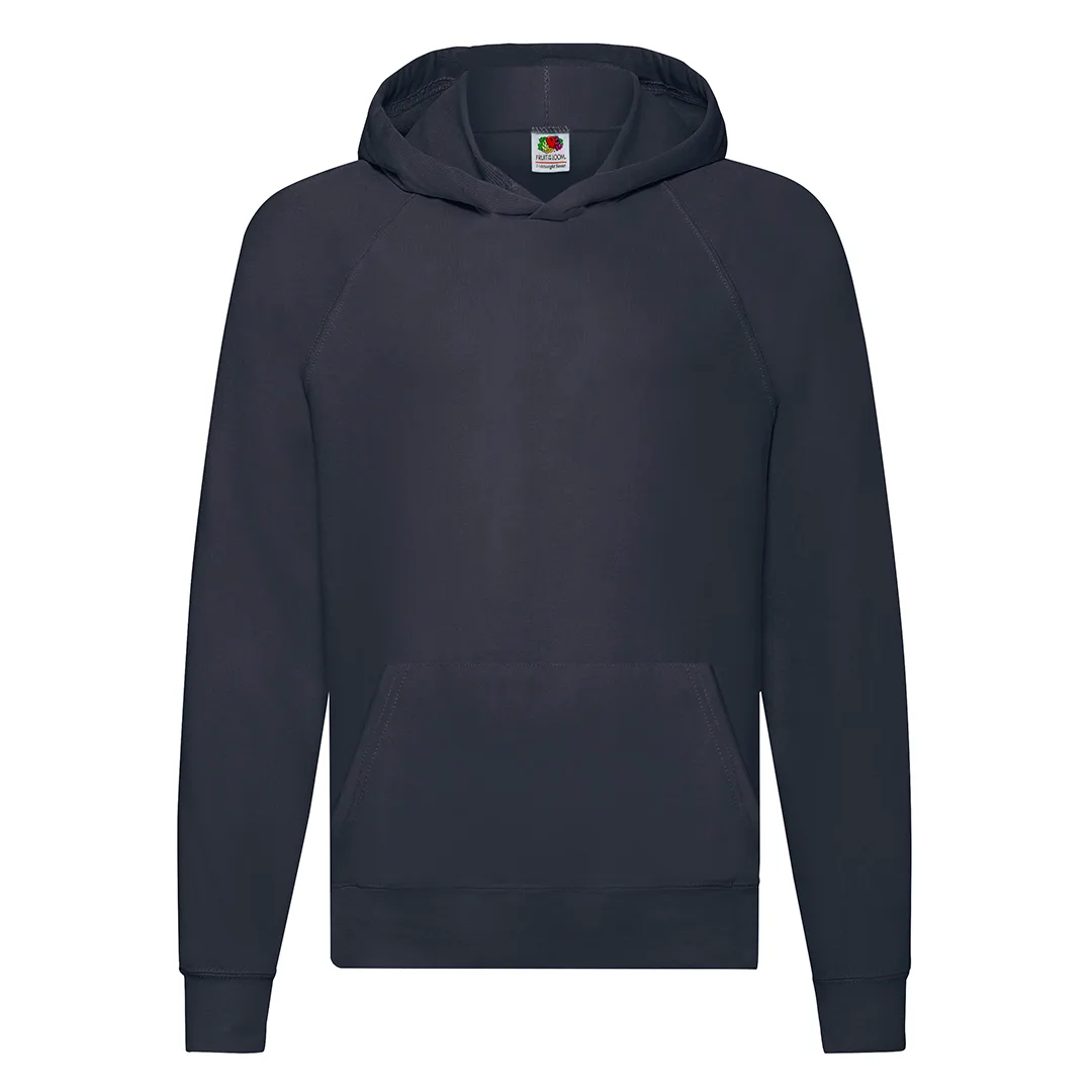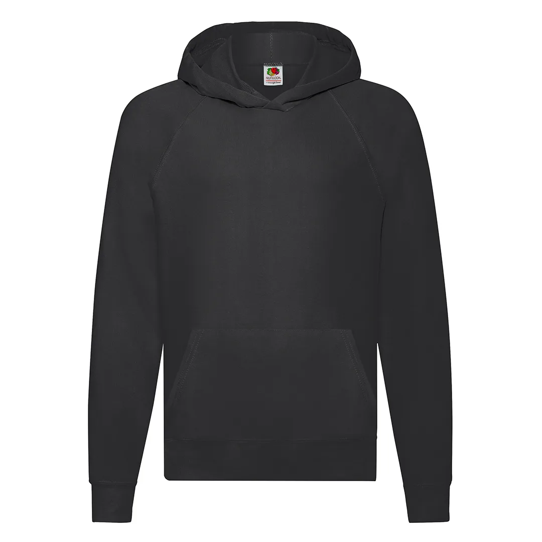 Camisola unisexo para crianças Lightweight Hooded Sweat de Fruit Of The Loom. Fabricada em felpo não escovado, numa combinação de materiais 80% algodão + 20% poliéster 240g/m2. Capuz sem cordão de ajuste para garantir a segurança das crianças e em conformidade com a legislação europeia sobre vestuário infantil. Mangas raglan e bolso frontal canguru, com cintura e punhos de algodão/LYCRA®. Disponível numa variada gama de cores e tamanhos 5-6, 7-8, 9-11, 12-13, 14-15.80% Algodão/ 20% Poliéster 240 g/ m2