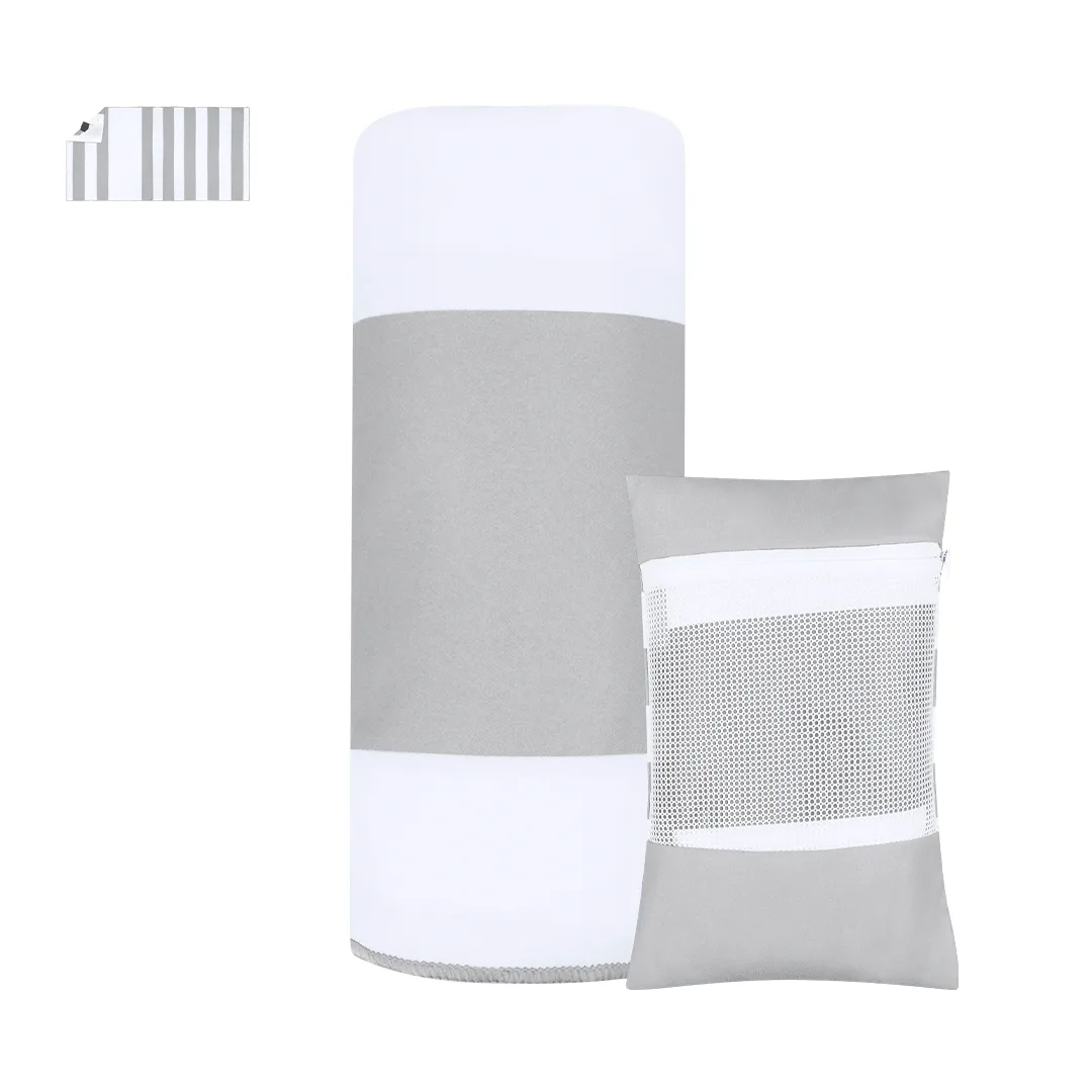 Ref: BEC00512MOToalha com bolso impermeável e capa. Fabricada em suave poliéster de 200g/m², inclui prático bolso impermeável triangular no canto, com fechamento de zíper ideal para proteger seus pertences pessoais. Seu design listrado é complementado por uma capa com rede e fechamento de zíper.