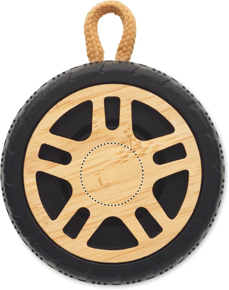 Altifalante sem fios 5.3 3W em forma de pneu de automóvel em ABS reciclado com pormenores em bambu e pega em algodão. Bateria recarregável de 400 mAh.Altifalante em forma de pneu