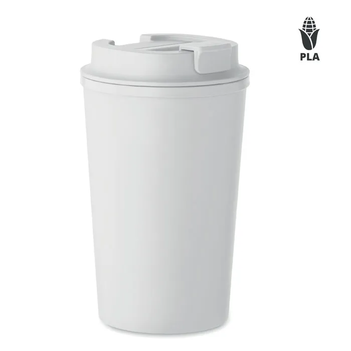 Copo de parede dupla em milho PLA com tampa de bebida em PP com TPR interior. Capacidade: 350 ml.Copo de parede dupla 350