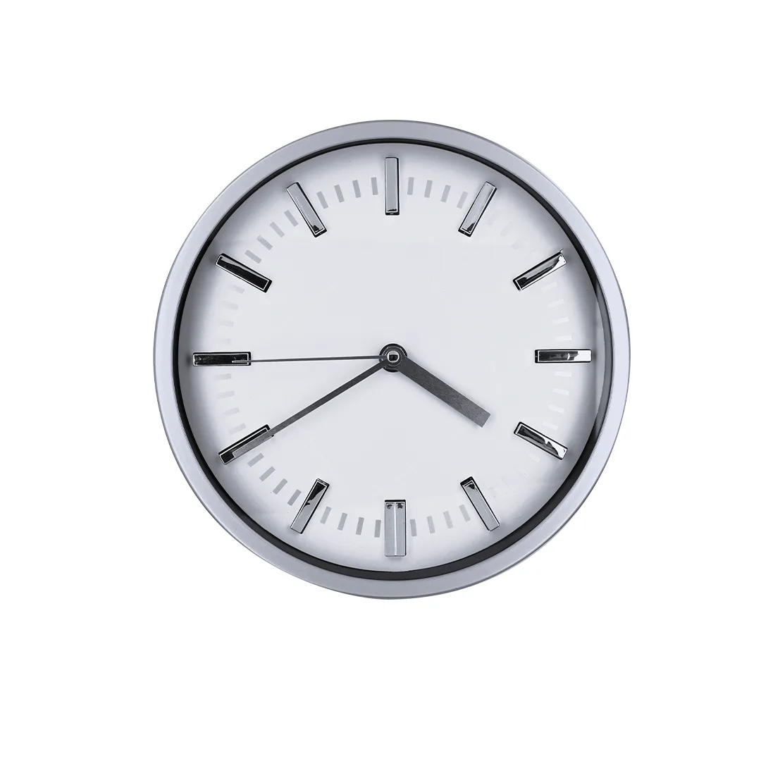 Ref: BEC01512MORelógio de parede fabricado com estrutura de alumínio e vidro. O mostrador é distinto por marcadores de horas cromados e quartos em tom prata, oferecendo um estilo sofisticado e funcional.Alimentação a pilhas (1xAA não incluída).