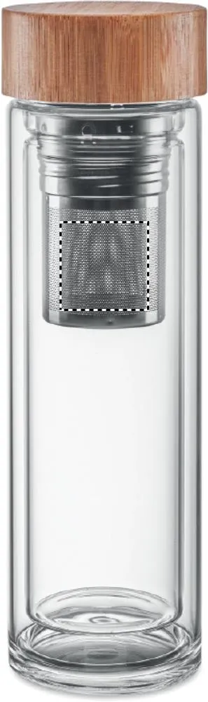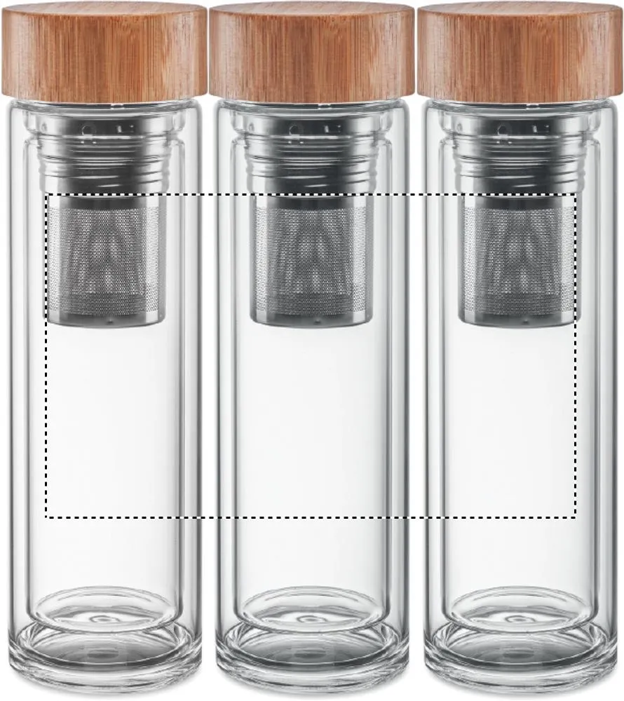 Garrafa de vidro com alto borossilicato e tampa de bambu com infusor de chá. Capacidade: 400 ml. O bambu é um material natural, a cor do item, o tamanho e a impressão podem variar. Anti vazamento. A gravação a laser não é possível em vidro borossilicatado.Garrafa vidro dupla face 400ml