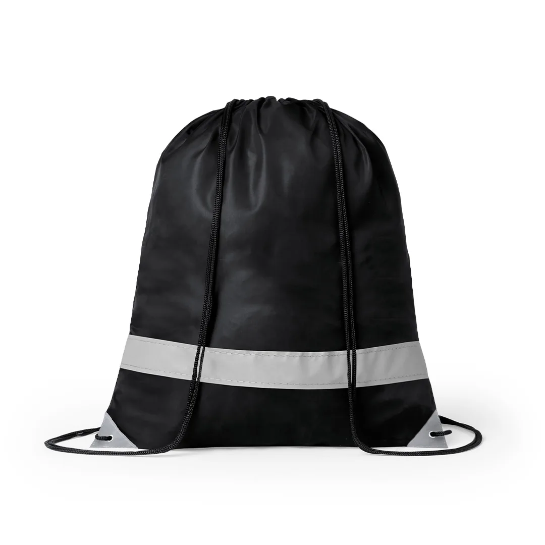 Mochila reflexiva em poliéster macio 190T em tons brilhantes, com faixa frontal reflexiva. Cordas pretas de fechamento próprio e cantos reflexivos reforçados com anéis de metal.Poliéster 190TRefletor