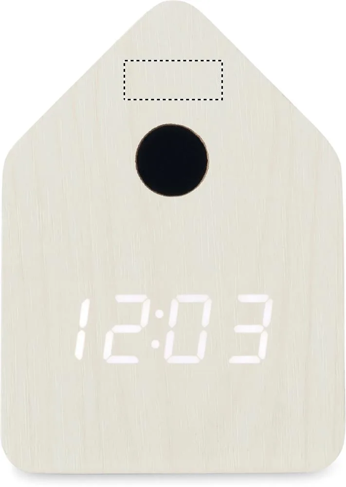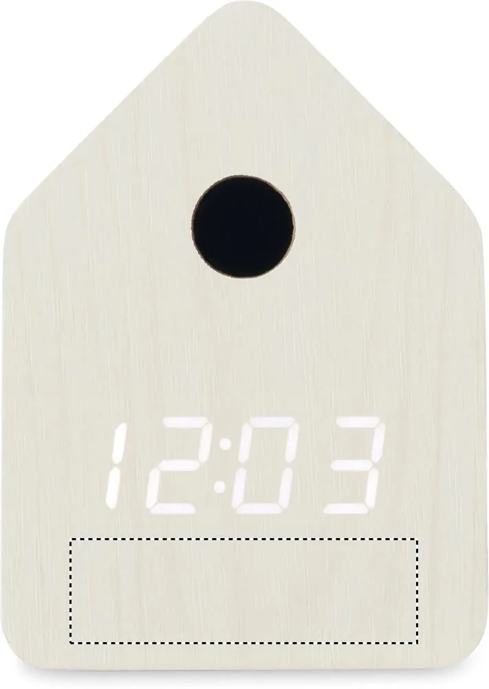 Pequeno relógio de secretária em MDF com alarme incorporado com voz de cuco de pássaro e indicação da temperatura. Ecrã LED branco. O som é automaticamente silenciado entre as 22.00h e as 06.00h. intervalos de adormecimento de 5 minutosDespertador de cuco em MDF