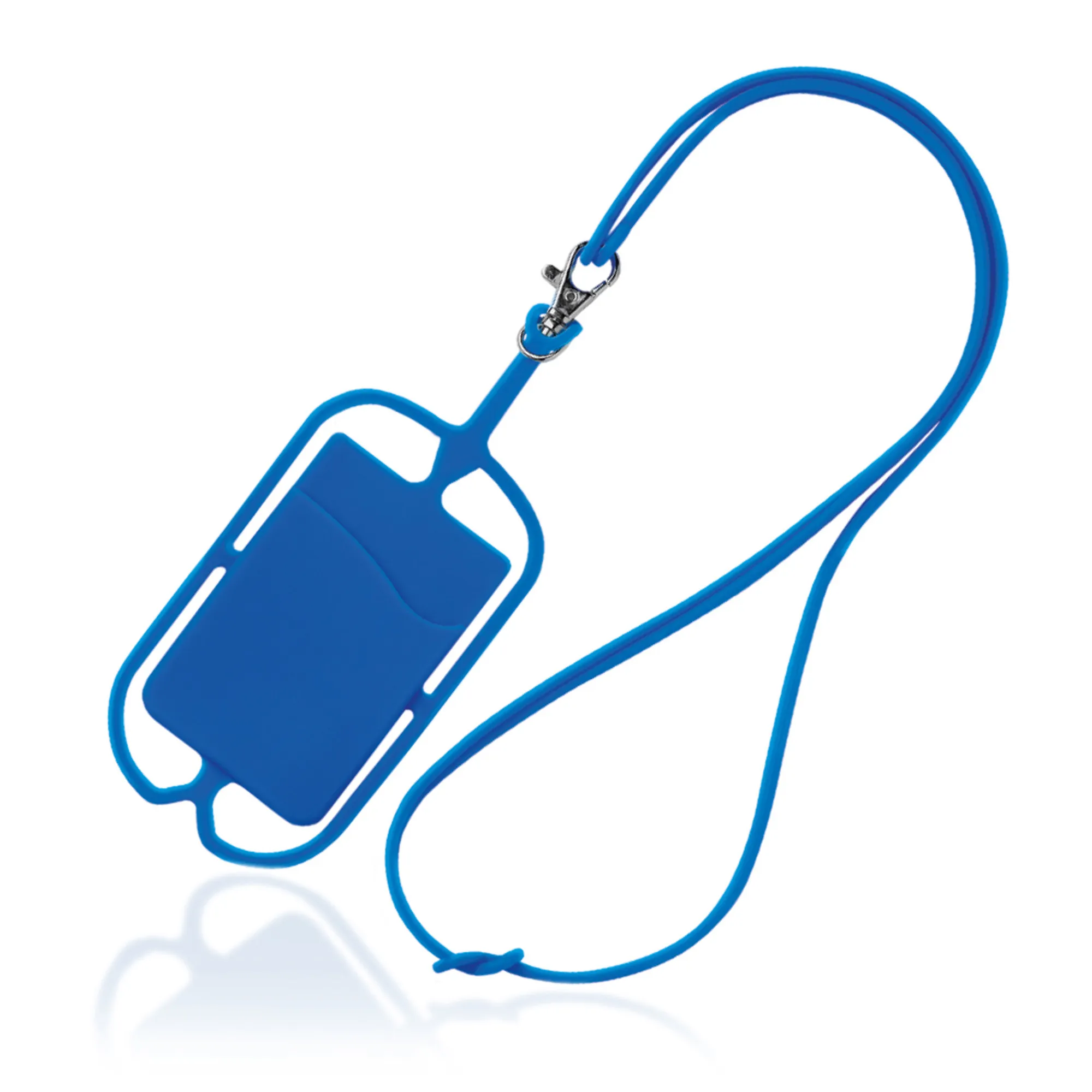 Lanyard em silicone, com porta-cartões e suporte para smartphone. Mosquetão metálico. Boa área de gravação.Lanyard em silicone, com porta cartões