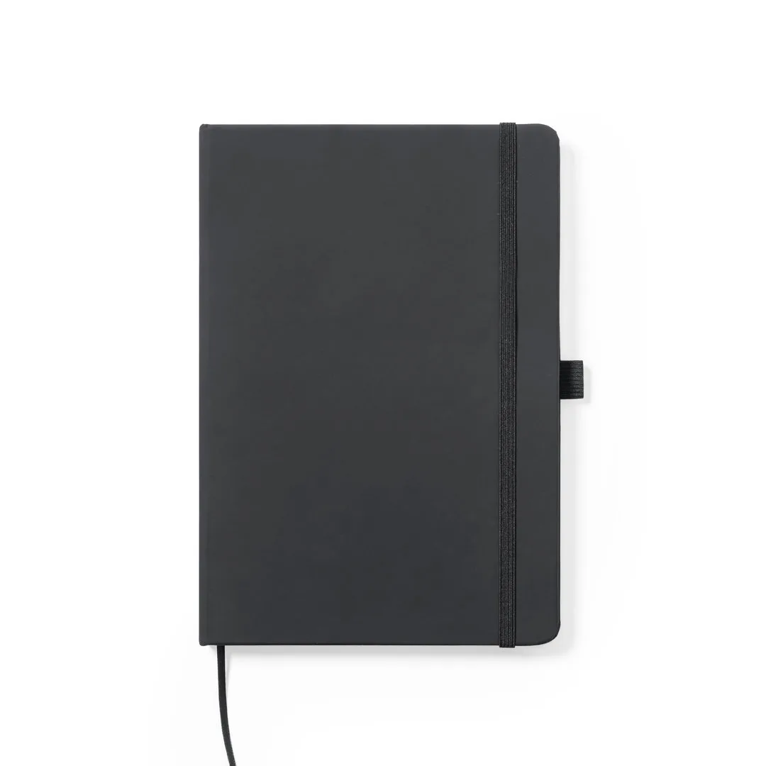 Bloco de notas fabricado em polipele de elegante acabamento em preto. Com capas duras, marca páginas e elástico de fixação a condizer. Interior com 100 folhas pautadas e suporte para esferográfica (esferográfica não incluída).PolipeleCapa Rígida. 100 Folhas