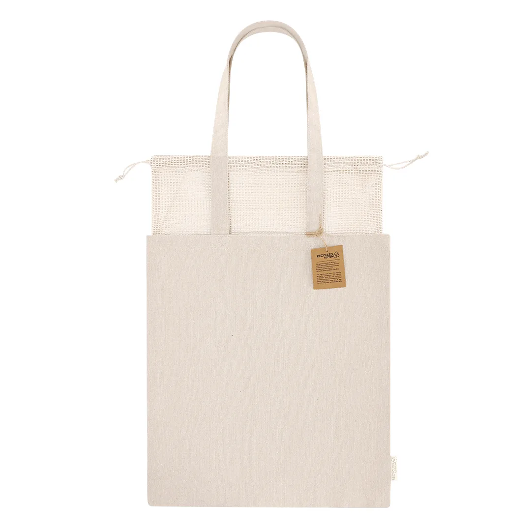 Bolsa fabricada principalmente em algodão reciclado de 260 g/m2 com sistema de fechamento superior a cordões, fabricada em rede. Alças longas de 70cm com reforço, de acabamento costurado. Logotipo na etiqueta lateral e resistência até 8 kg de peso.Algodão Reciclado 260 g/ m2
