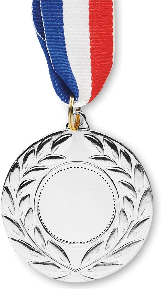 Medalha de ferro com fita de poliéster nas cores azul, branco e vermelho. 5 cm de diâmetroMedalha ferro 5cm diâmetro