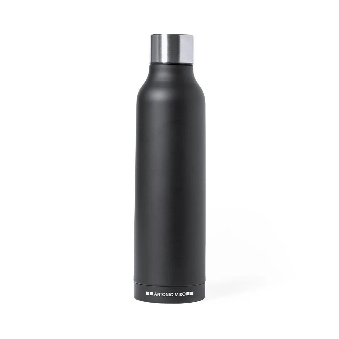 Termo de aço inoxidável Antonio Miró. De 500ml de capacidade e com parede dupla para uma melhor e mais duradoura conservação da temperatura. Com um acabamento preto acetinado sóbrio, logótipo da marca na base e tampa de rosca cromada. Apresentado numa atrativa caixa de design com logótipo da marca.Aço Inox500 ml