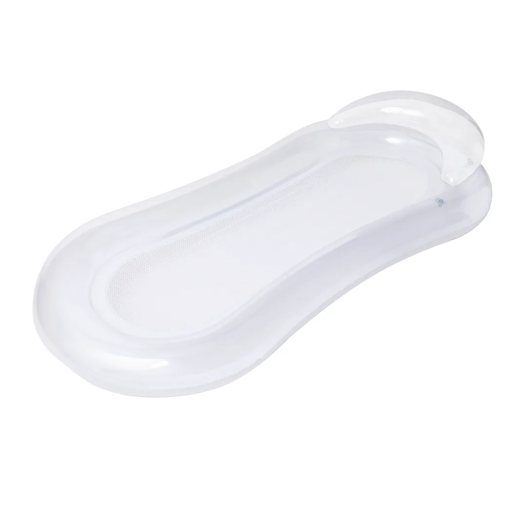 Original colchão em resistente PVC. Inclui uma confortável almofada de cabeça com design bicolor, nas cores transparente e branco. Inclui uma resistente rede central em poliéster de cor branca. Com dobragem especial para facilitar a impressão. Servido vazio e numa prática bolsa individual reciclada.PVC/ PoliésterDobrado Especial para Impressão