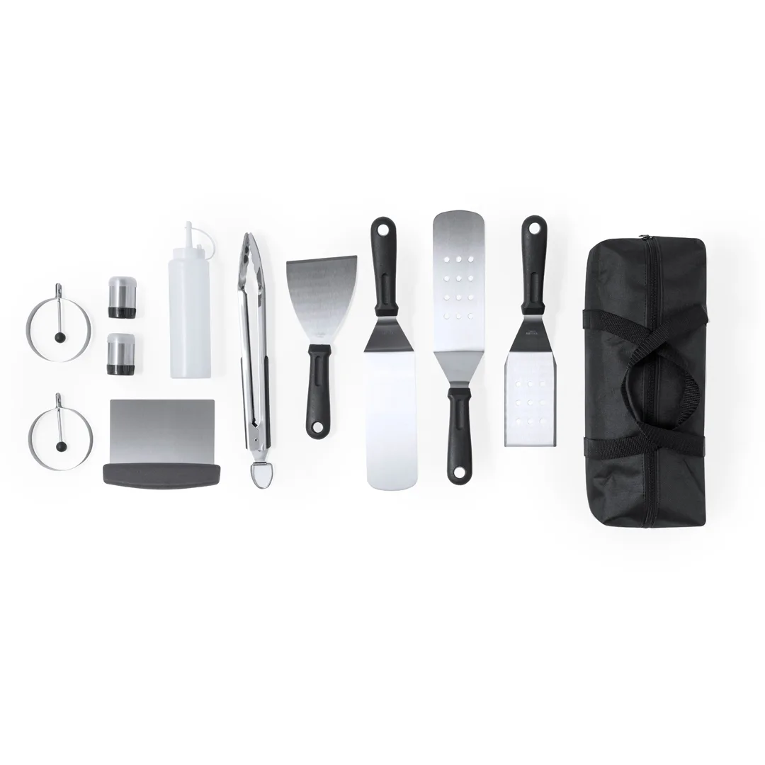 Set de churrasco fabricado em aço inoxidável. É composto por 11 acessórios, entre eles: 1 espátula lisa, 2 espátulas com orifícios, 1 raspador, 1 pinça, 1 espátula, 1 saleiro, 1 pimenteiro, 1 recipiente com doseador e 2 formas redondas. Tudo se apresenta de maneira organizada numa prática bolsa com fecho de correr e pegas para facilitar o seu transporte. Apresentado individualmente em saco reciclado.Aço Inox11 Acessórios. Bolsa Poliéster