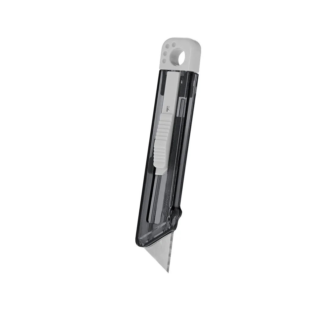 Cortador em PS de acabamento translúcido. Com um mecanismo de botão de retração automática e uma lâmina de aço de 6 x 1,9 cm, sem sistema de bloqueio (stopper).
