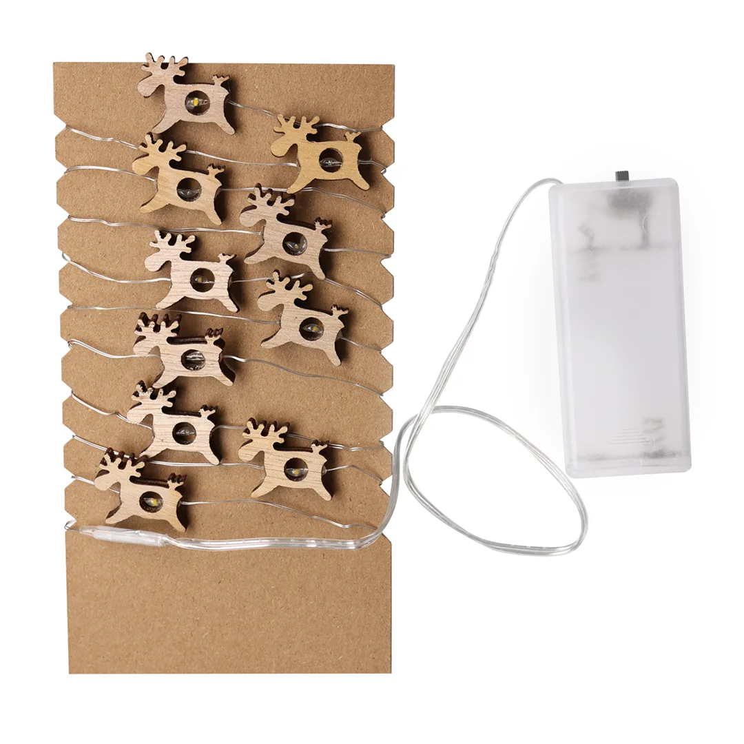 Ref: BEC08312MOGrinalda iluminada feita de madeira natural. Um acessório de decoração original com enfeites em materiais naturais, combinando formas de estrelas e renas. Com 20 LEDs quentes. Alimentação por bateria (2xAA não incluídas). Apresentado em uma caixa kraft atraente com recorte em forma de estrela.Feito com elementos de origem vegetal para promover o uso de matérias-primas naturais e reduzir as emissões poluentes.