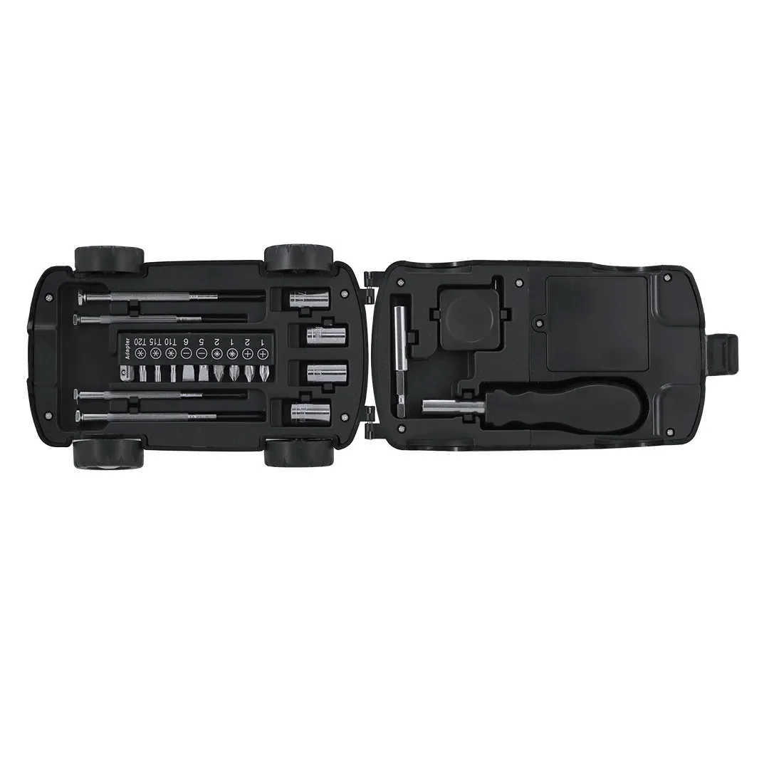 Conjunto de ferramentas com estojo em forma de carro e lanterna LED. Com 20 ferramentas. Inclui: - Conjunto de chaves de fenda de precisão (planas e philips)- Ferramenta de fixação- Cabo multifuncional com cabeçotes de chaves de fenda planas e estrela- Chaves para porcas de cabeça hexagonal- Fita métricaCom lanterna com 2 LEDs integrada no estojo, alimentada por 4 pilhas AAA (não incluídas).2 Leds. 20 Acessórios. 4 Pilhas AAA Não Incluídas