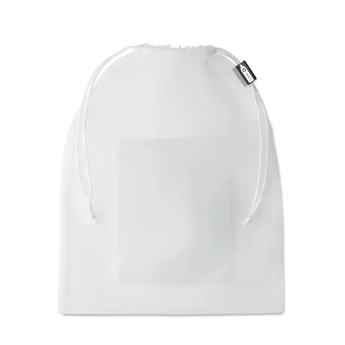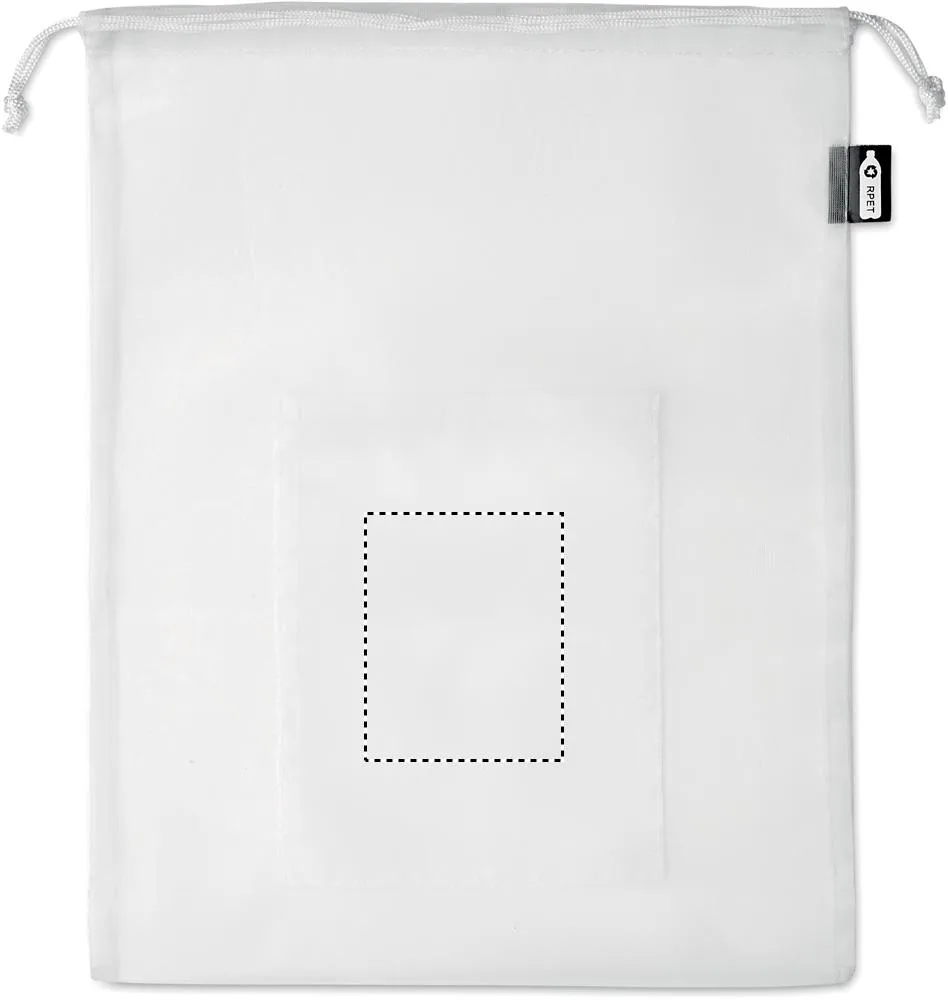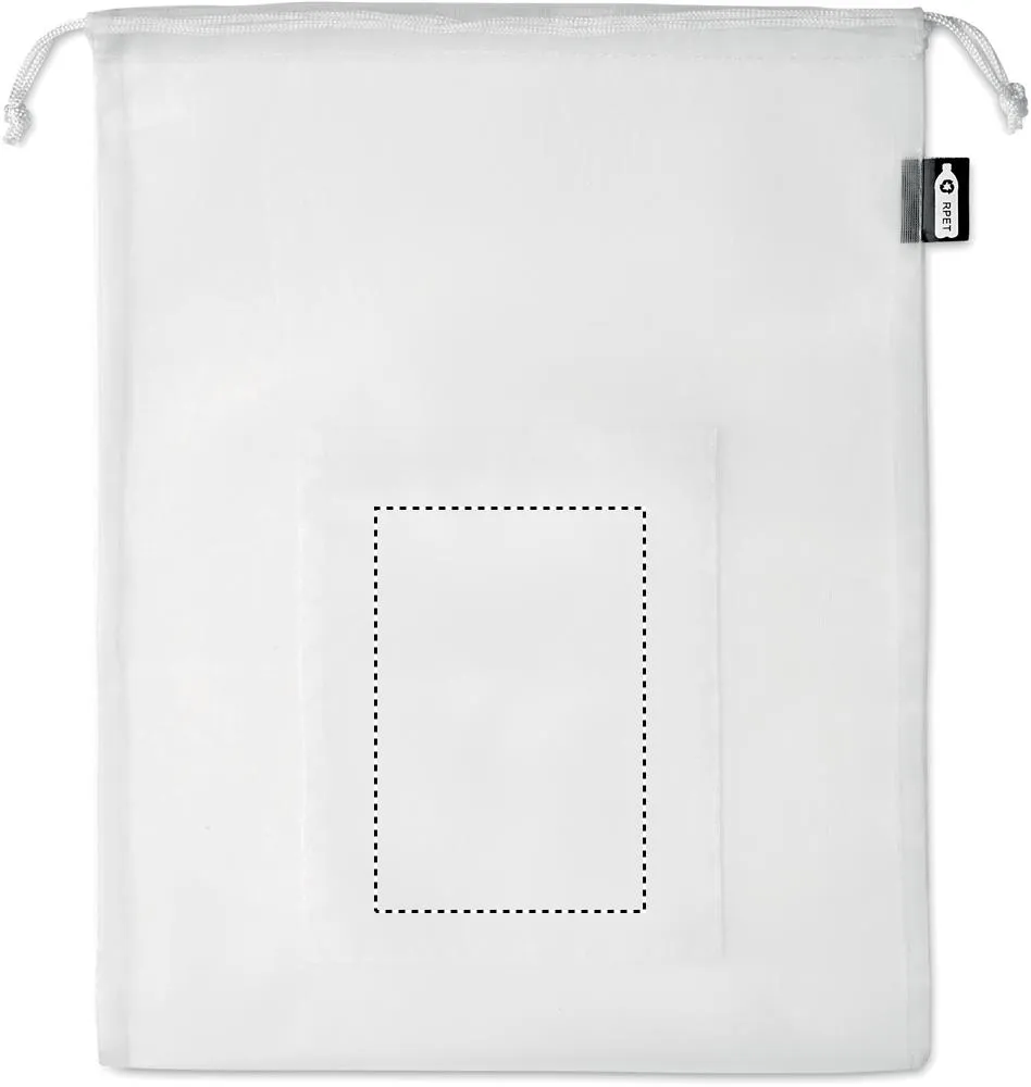 Saco para alimentos em malha RPET com bolso frontal e cordão de PP branco na parte superior.Saco para alimentos malha RPET