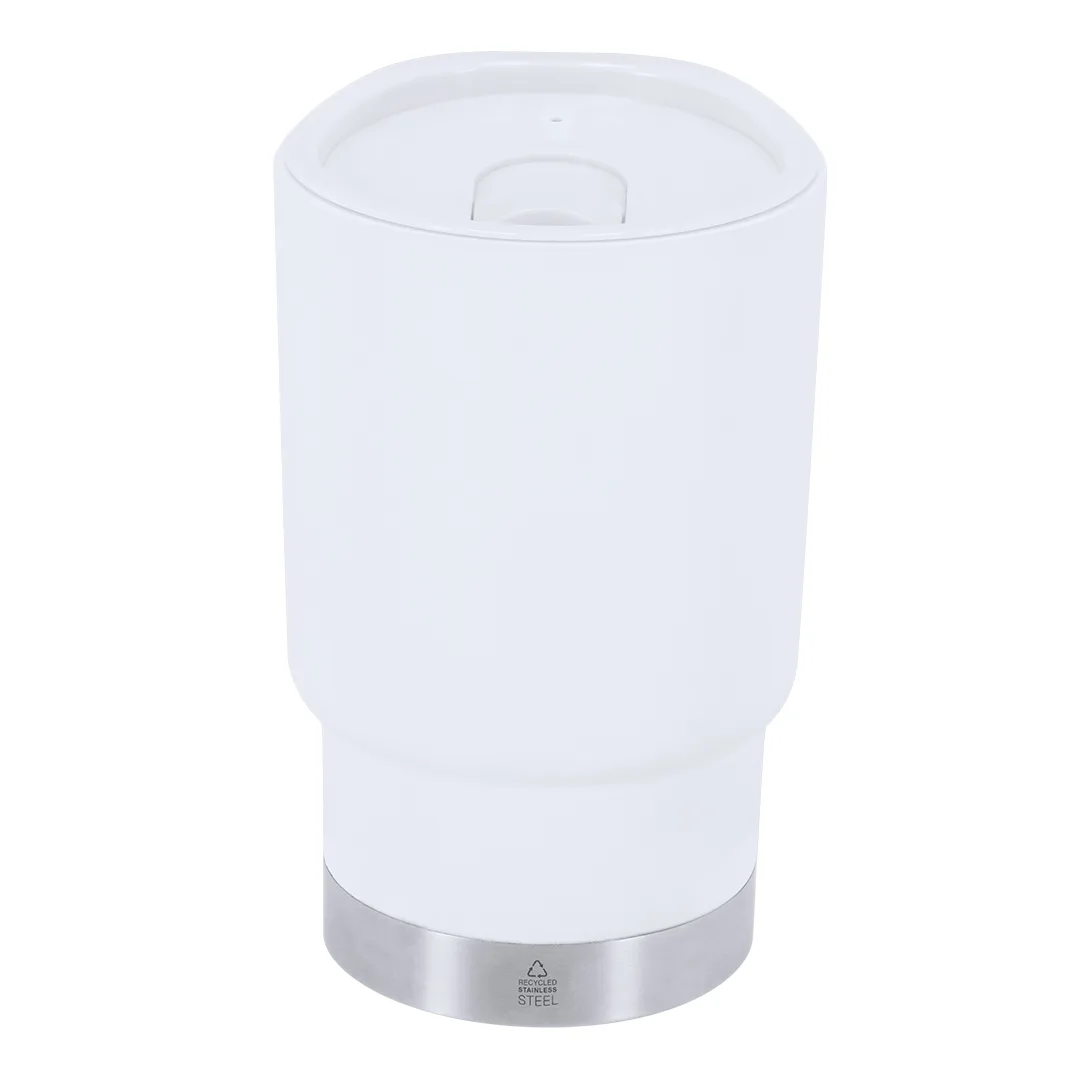 Copo térmico de 380 ml. Fabricado em resistente PP Reciclado de parede dupla, combinado com base em Aço Inoxidável Reciclado. Tampa com doseador de fácil abertura, livre de BPA. Ideal para a secretária, mesa ou qualquer superfície onde possa desfrutar tranquilamente da sua bebida preferida. Com certificação Food Grade, garantindo a segurança no contacto com alimentos. Inclui distintivo de Aço Inoxidável Reciclado. O PP Reciclado é um plástico reciclado e altamente reciclável, de grande resistência e adequado para inúmeras aplicações. O aço é um dos materiais mais procurados e pode ser encontrado quase em todo o lado, desde produtos de uso diário até grandes construções. Com inúmeras propriedades, destacando-se a durabilidade e o elevado grau de reutilização, torna-se uma alternativa muito valorizada em soluções de sustentabilidade. Quando devidamente tratado, permite obter novos recursos de utilização infinita.PP Reciclado/ Aço Inox Reciclado380 ml