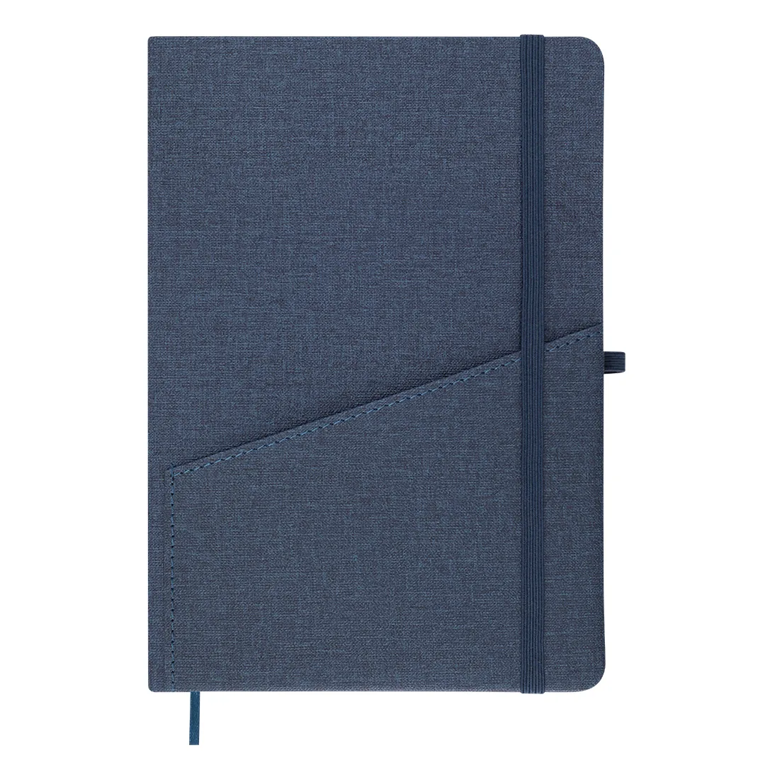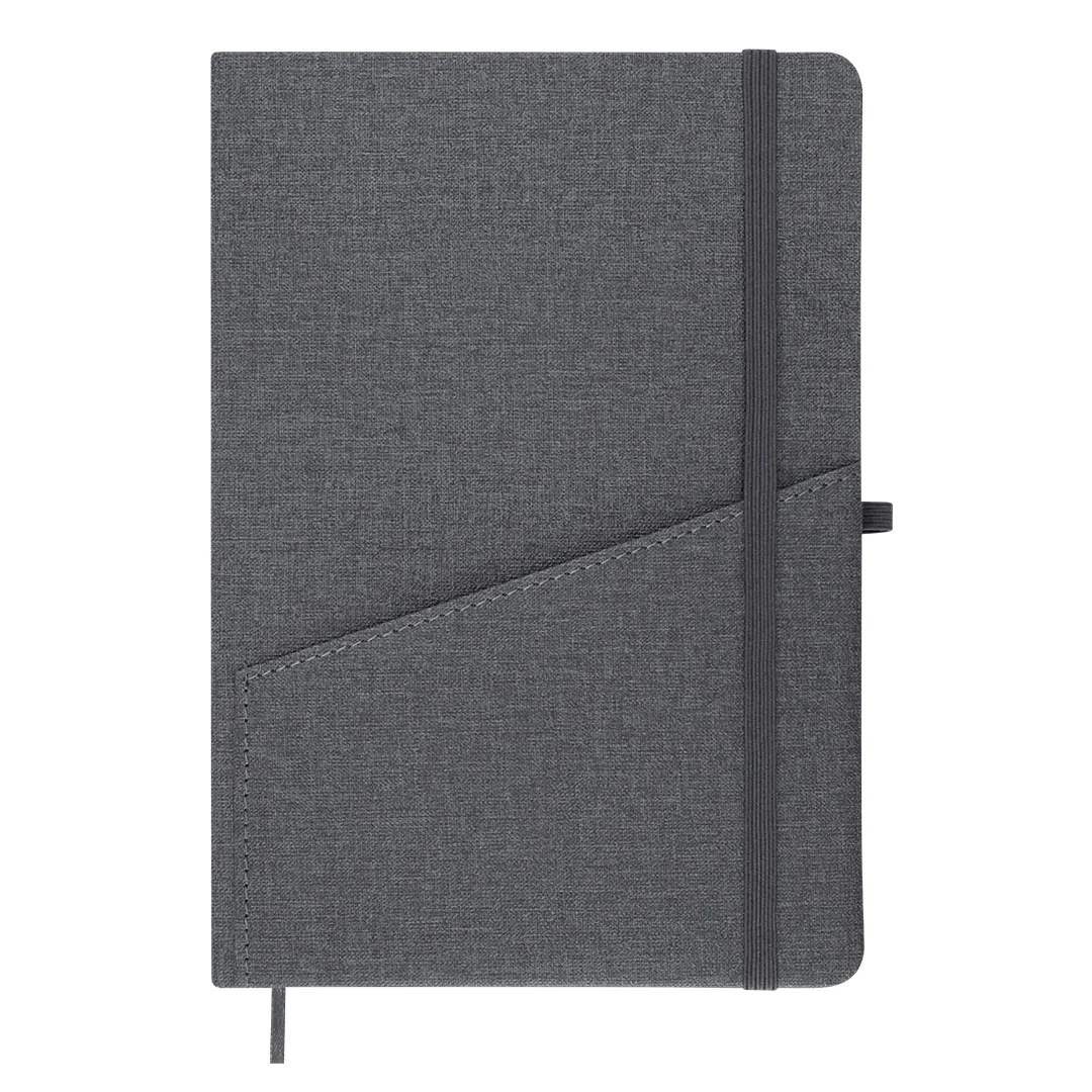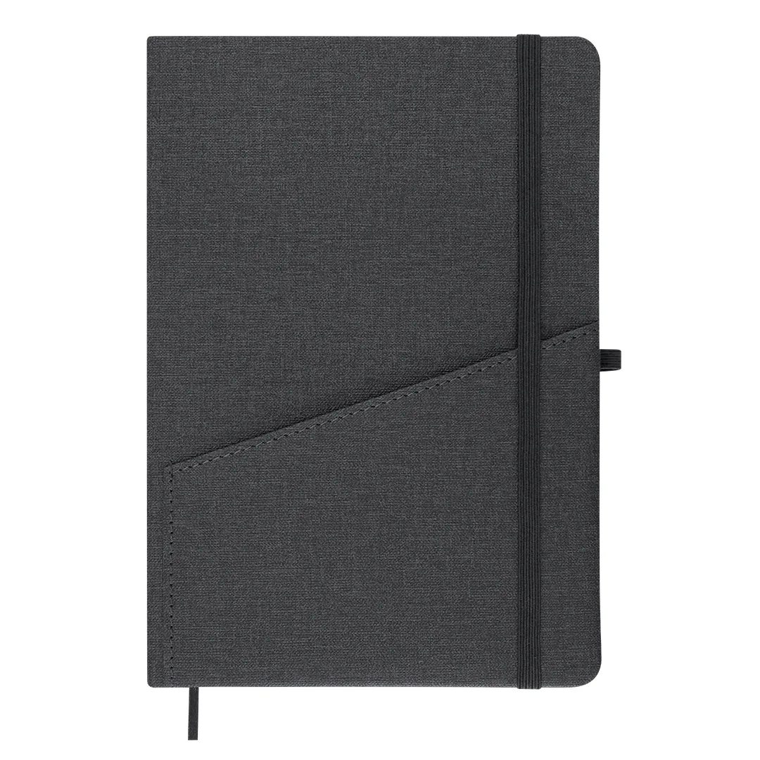 Bloco de notas com capas rígidas em PU Reciclado, acabamento linho. Com bolso frontal prático, suporte para caneta, marcador de páginas e fita elástica de fecho a condizer. Inclui 80 folhas em cor creme com linhas. Com distintivo de PU Reciclado. O PU Reciclado destaca-se pela sua resistência e elasticidade. Este material reciclado e reciclável é uma opção sustentável que recupera as fibras descartadas nos processos de fabrico, minimizando assim o desperdício de material e contribuindo para reduzir o impacto ambiental, mantendo ao mesmo tempo as suas propriedades originais.PU RecicladoCapa Rígida. 80 Folhas