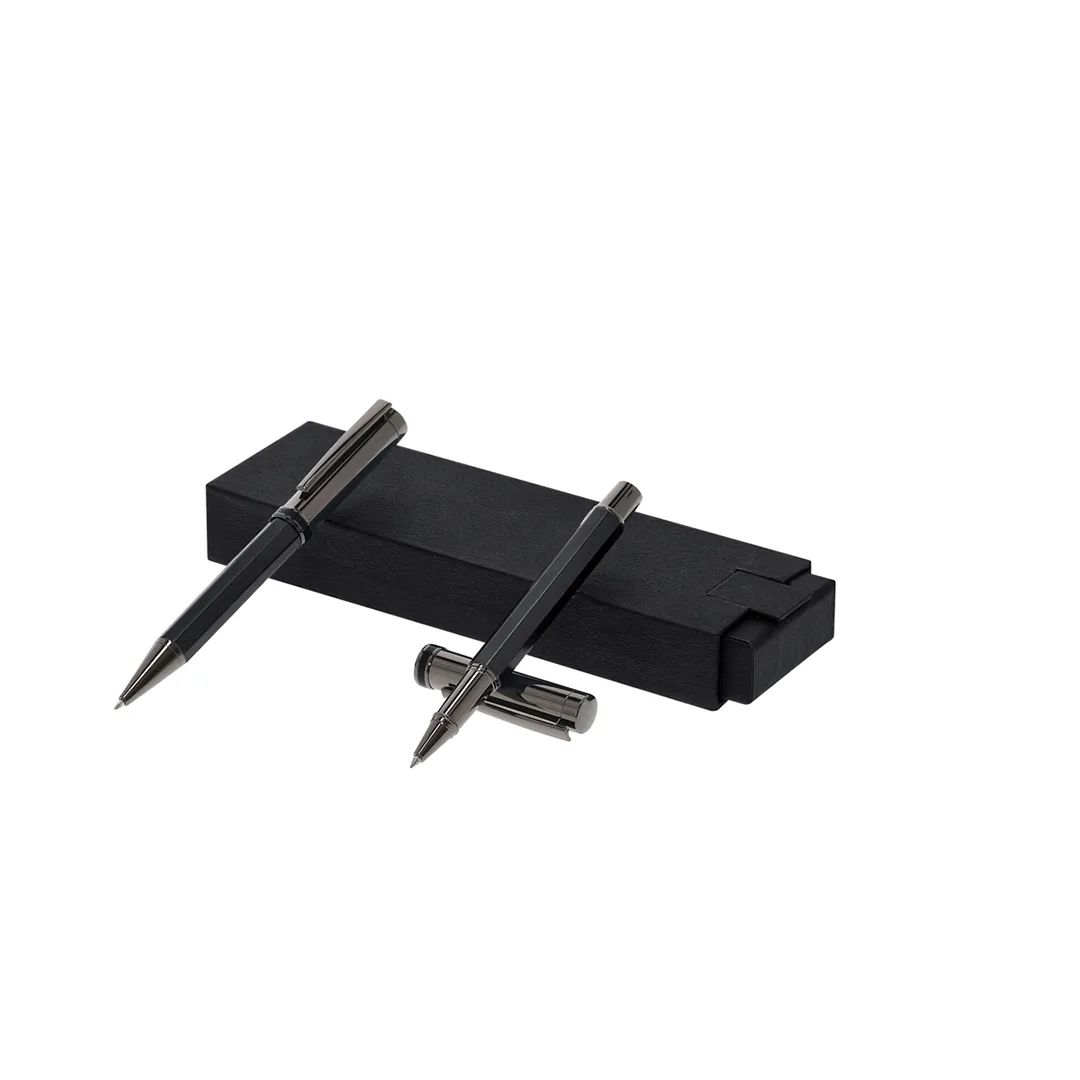 Conjunto exclusivo de caneta esferográfica e roller de mais alta qualidade da coleção Limited Edition. Um acessório moderno, funcional e deslumbrante que transcende todas as expectativas. Distinguido por seu design elegante e minimalista. Feito de aço inoxidável forte e durável, em perfeita combinação com alumínio. Caneta esferográfica com sofisticado sistema de abertura por torção e caneta roller com tampa prática. Design de aderência hexagonal em cores metálicas foscas e parte superior brilhante em antracite sóbria. Com clipe de metal, tinta azul e recarregável (caneta roller com cartucho jumbo).Da combinação perfeita de exclusividade e design, nasce a Limited Edition, uma coleção especial de ideias promocionais em edição limitada. Um novo conceito, inspirado na fusão de produtos premium com as tendências mais recentes e inovadoras e com uma seleção limitada disponível, transformando um presente em uma experiência única e inesquecível.Estojo de apresentação Exclusivo Limited Edition, com um design protegido por direitos de propriedade industrial.Inclui cartão com descrição da Limited Edition em papelão reciclado.Alumínio/ Aço InoxEsferográfica e Roller