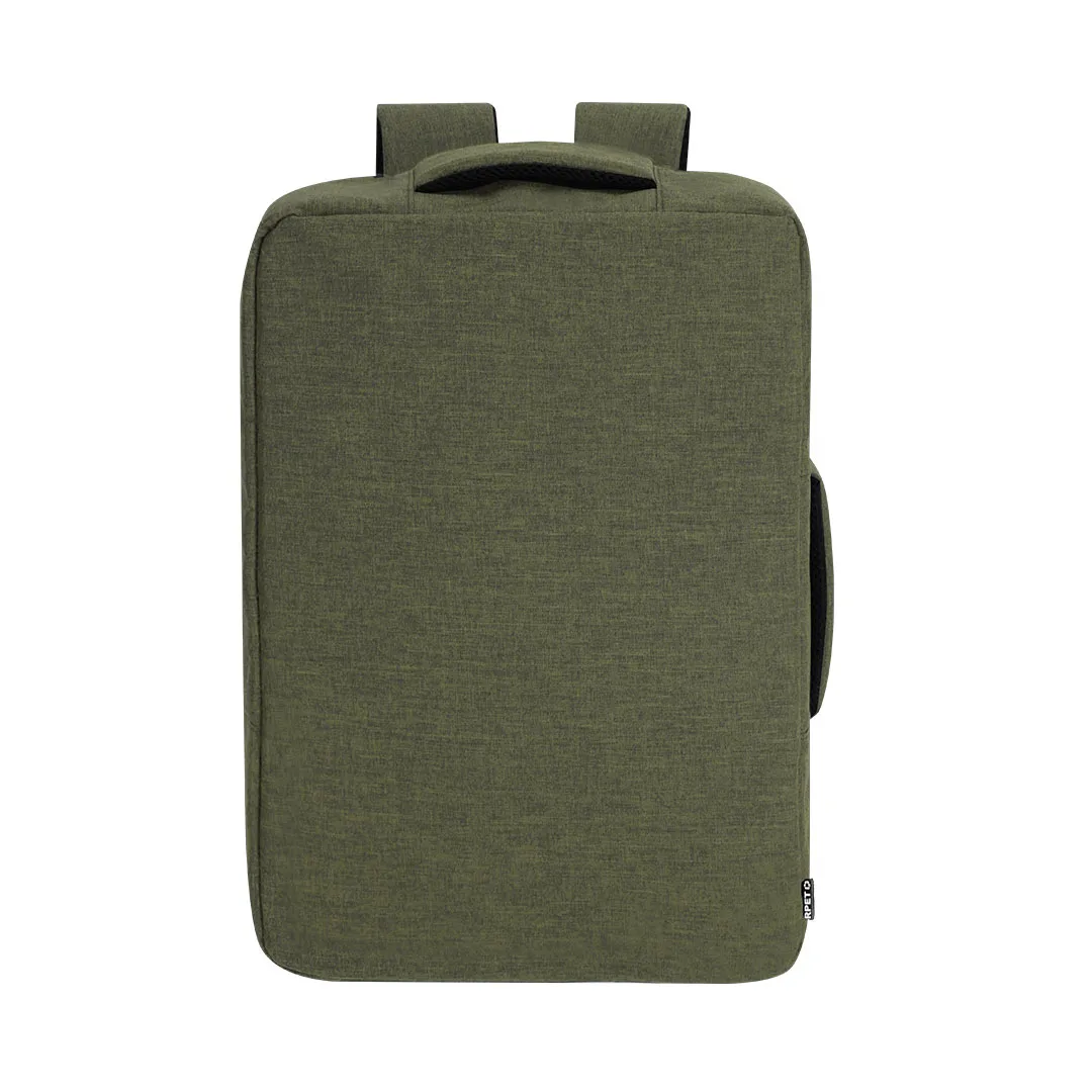 Mochila porta-documentos confeccionada em resistente RPET 300D. Apresenta um design urbano que incorpora um bolso principal com fechamento de zíper oculto para maior proteção, com puxador duplo. Com interior acolchoado para laptop de até 15 polegadas, bolsos adicionais por dentro para pequenos objetos. Suas tiras de ombro e as costas estão acolchoadas e são ajustáveis para maior conforto. Oferece três modalidades de transporte: como mochila, pelas tiras de ombro acolchoadas; como pasta, pela sua alça de transporte; e fita para carrinho. O material RPET é elaborado a partir de plástico reciclado, para promover a reutilização de resíduos plásticos e ajudar a sustentabilidade do planeta.Poliéster 300D RPETBolso Acolchoado para Portátil. Parte Traseira e Alças Acolchoadas