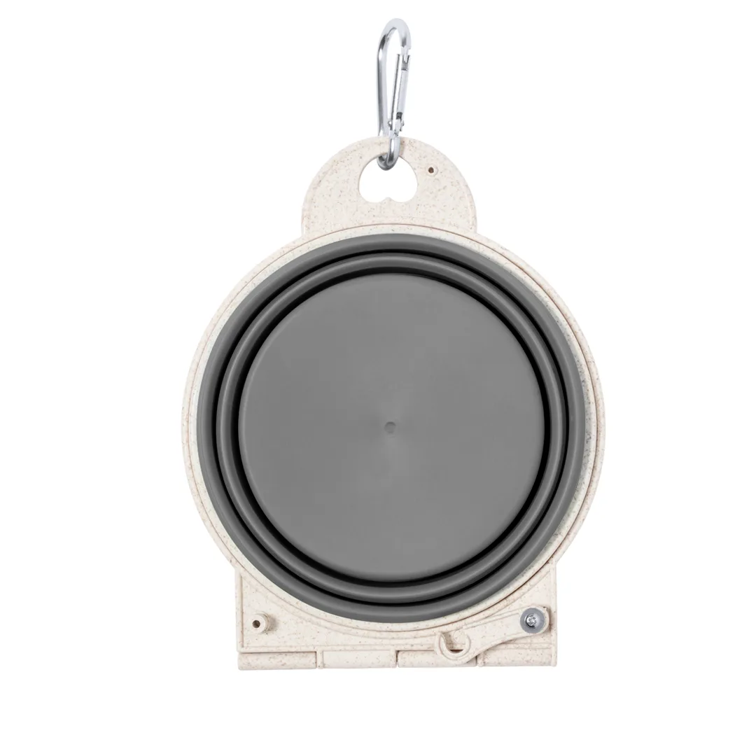 Tigela dobrável para animais de estimação feita de palha de trigo. De desenho compacto, com dois compartimentos e perfeito para usar em qualquer lugar. Inclui mosquetão de transporte de fácil fixação. Apresentado nuam bolsa individual reciclada.A palha de trigo promove a utilização de matérias-primas naturais, reduzindo assim as emissões de poluentes.Palha de Trigo/ ABS/ TPR