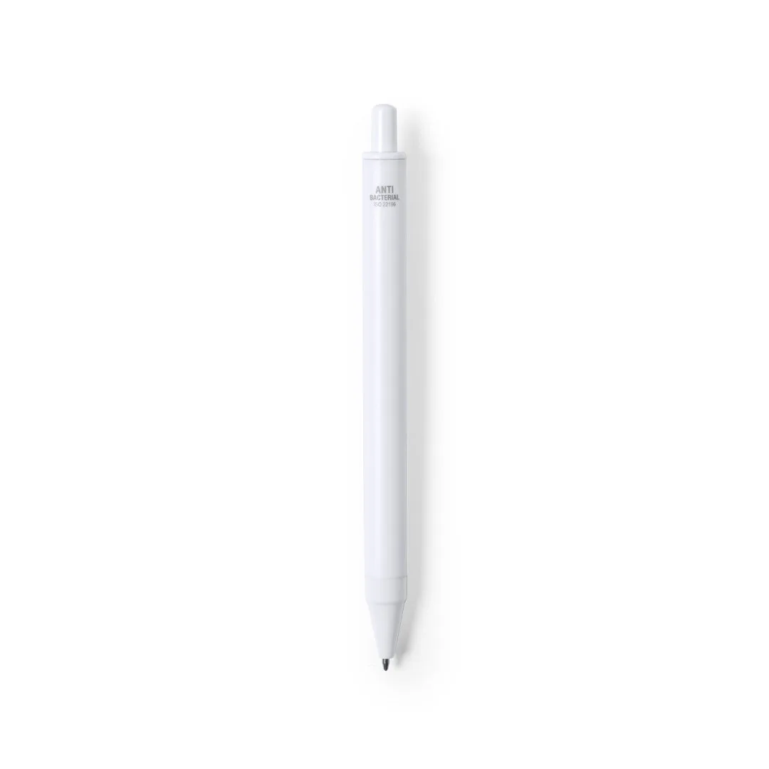 Esferográfica antibacteriana de mecanismo pulsador com termómetro integrado no clip. Design monocromático, especialmente desenhada para impressão em tampografia. Com tinta azul e apresentada em bolsa de design individual.Os produtos com tratamentos antibacterianos são capazes de reduzir drásticamente as cargas bacterianas presentes nas superfícies dos materiais, graças à incorporação de agentes microbianos permanentes estáticos, com alta eficácia para inibir e prevenir a contaminação bacteriana.Artigo de acordo com a ISO 22196, que determina a atividade antibacteriana em materiais plásticos e superfícies não porosas, o que permite conhecer a eficácia da inibição microbiana que os aditivos têm sobre os objetos tratados mediante uma avaliação quantitativa.Função Termómetro