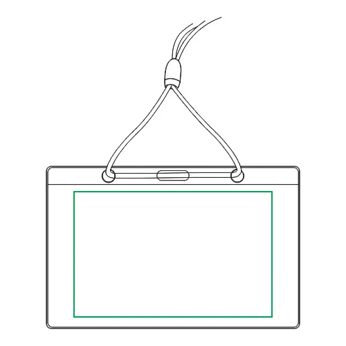 Identificador em PVC com fio de pescoço. Com acessório em plástico para ajuste da altura do cordão, o porta-credencias tem orientação horizontal.Identificador em PVC, com fio de pescoço