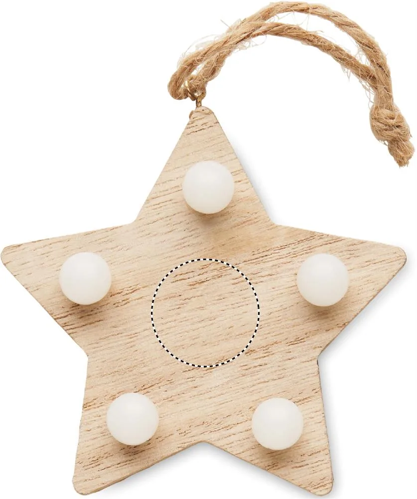 Ornamento em forma de estrela decorado em madeira (80% choupo e 20% erva) com 5 luzes LED e corda para pendurar. Inclui 1 pilha CR2032. O madeira é um material natural, a cor do item, o tamanho e a impressão podem variar.Estrela de madeira com luzes