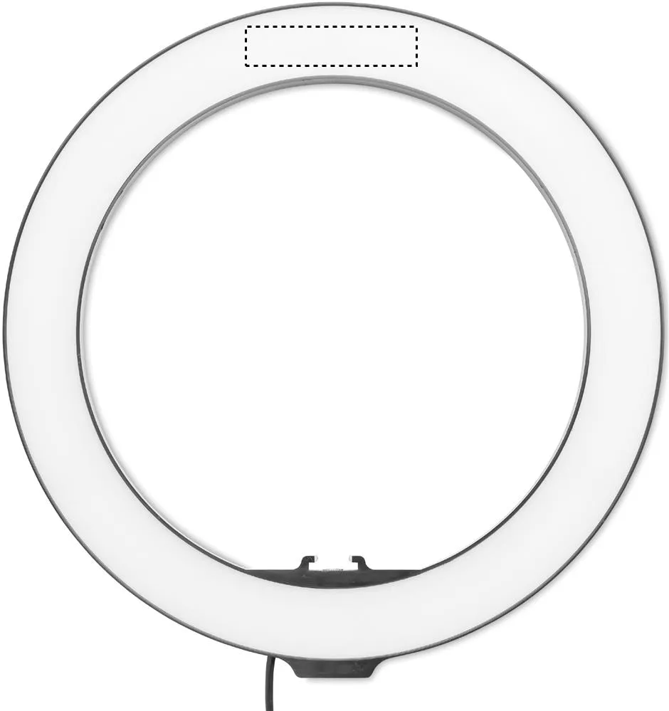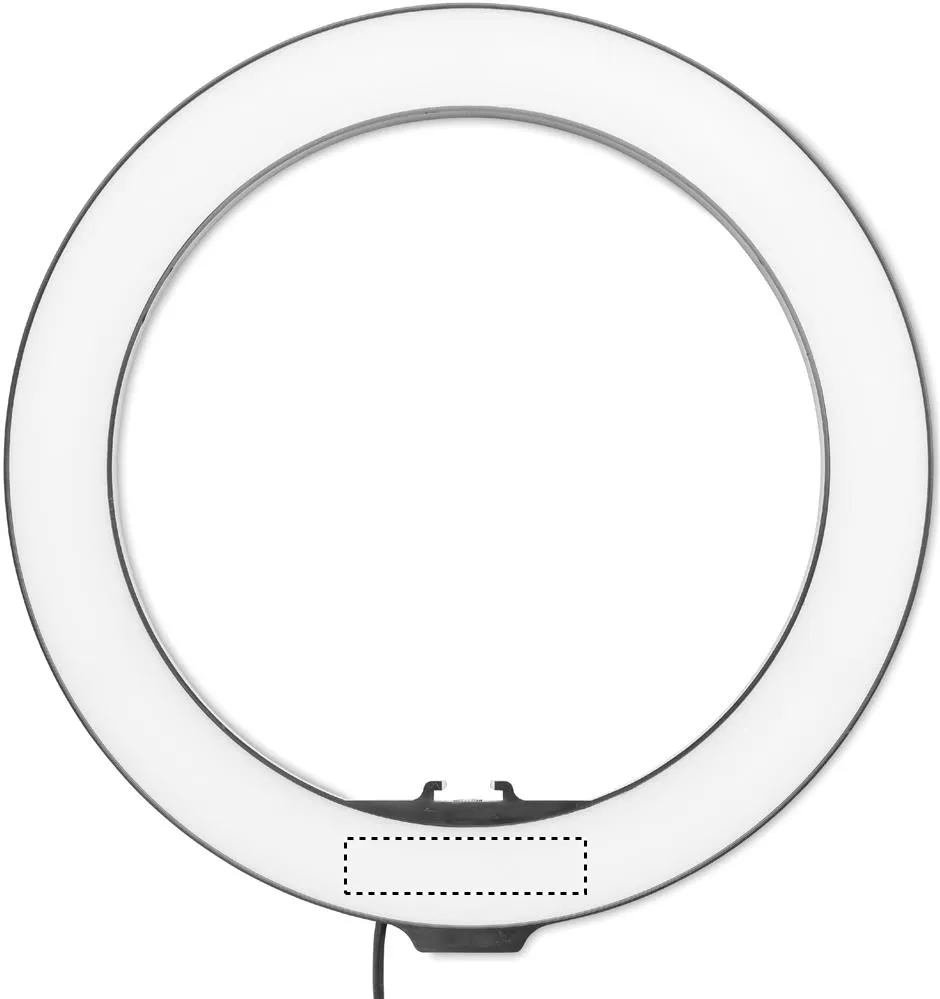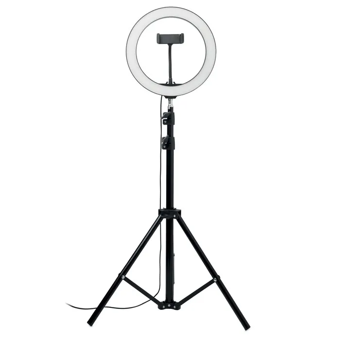Anel de luz selfie LED de 26cm com tripé (160cm) e suporte telefónico. Ideal para tik-tok®, live streaming, ensaio fotográfico e partilha. Inclui obturador com fio. Luz branca quente (120 LED) com 10 níveis de luminosidade. O tripé é extensível até uma altura máxima de 173 cm.Tripé de 26 cm com luz LED
