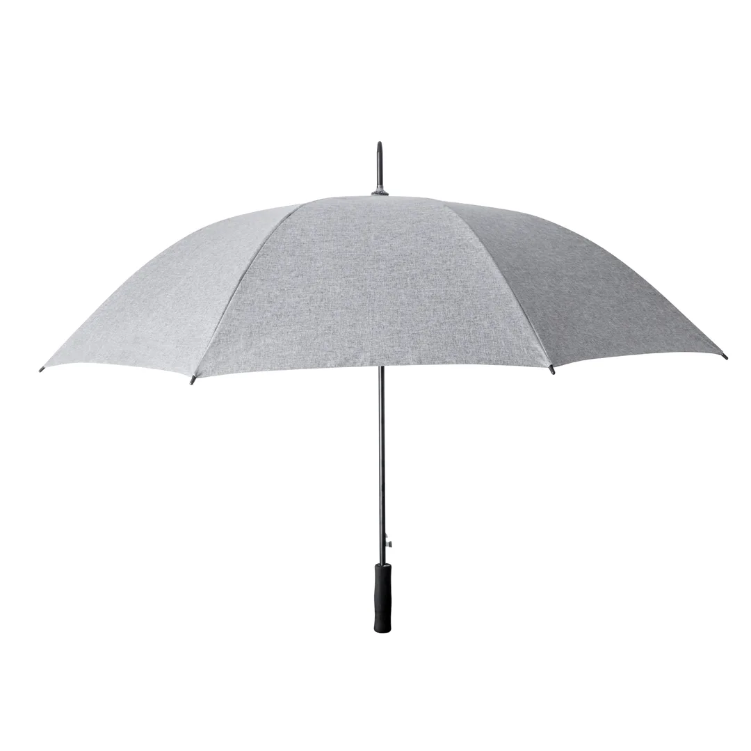 Chapéu de chuva de alta qualidade e130 cm de diâmetro, fabricado em poliéster 150D, num elegante tom cinzento marmorizado. Abertura automática, varetas de fibra de vidro à prova de vento e fecho de velcro. Cabo reto fabricado em EVA. Apresentado numa bolsa reciclada.Poliéster 150D. Varas Fibra de Vidro30". Automático. Sistema Anti-Vento. Pega EVA