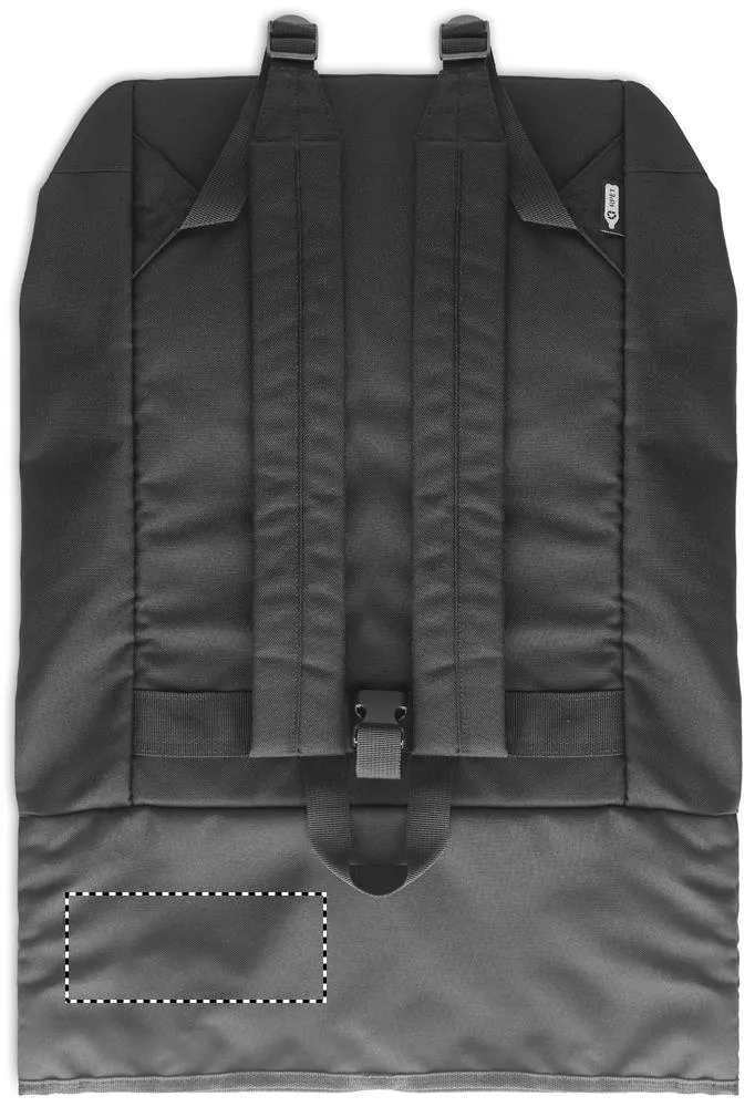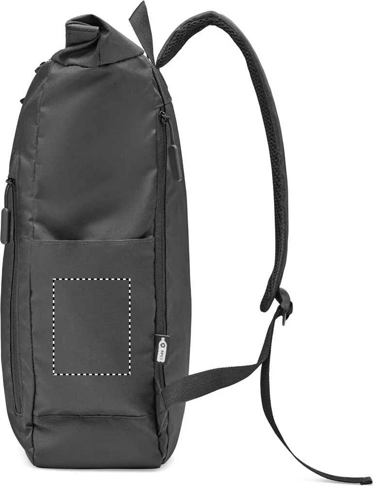 Mochila para portátil 15'' com tampa de enrolar em poliéster RPET 300D. Grande bolso frontal com fecho, bolso lateral oculto com um mosquetão no interior (utilização do mosquetão não é profissional).Mochila rolltop 300D RPET 15"