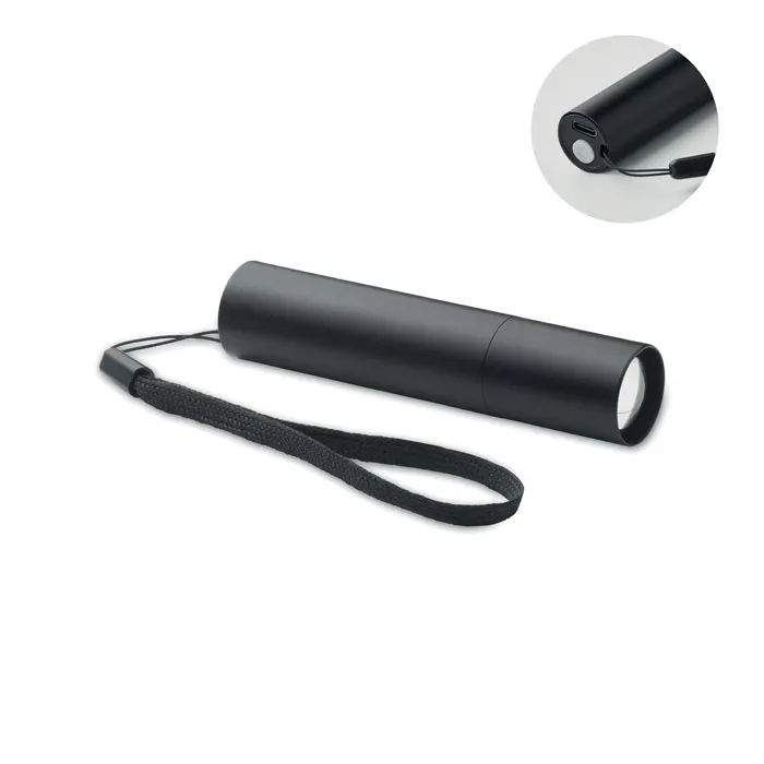 Lanterna recarregável de alumínio de 110 lúmens com 3 configurações de luz e função de aumentar/diminuir zoom. Bateria recarregável integrada de 400mAh e cabo de carregamento incluídos.Lanterna recarregável alumínio