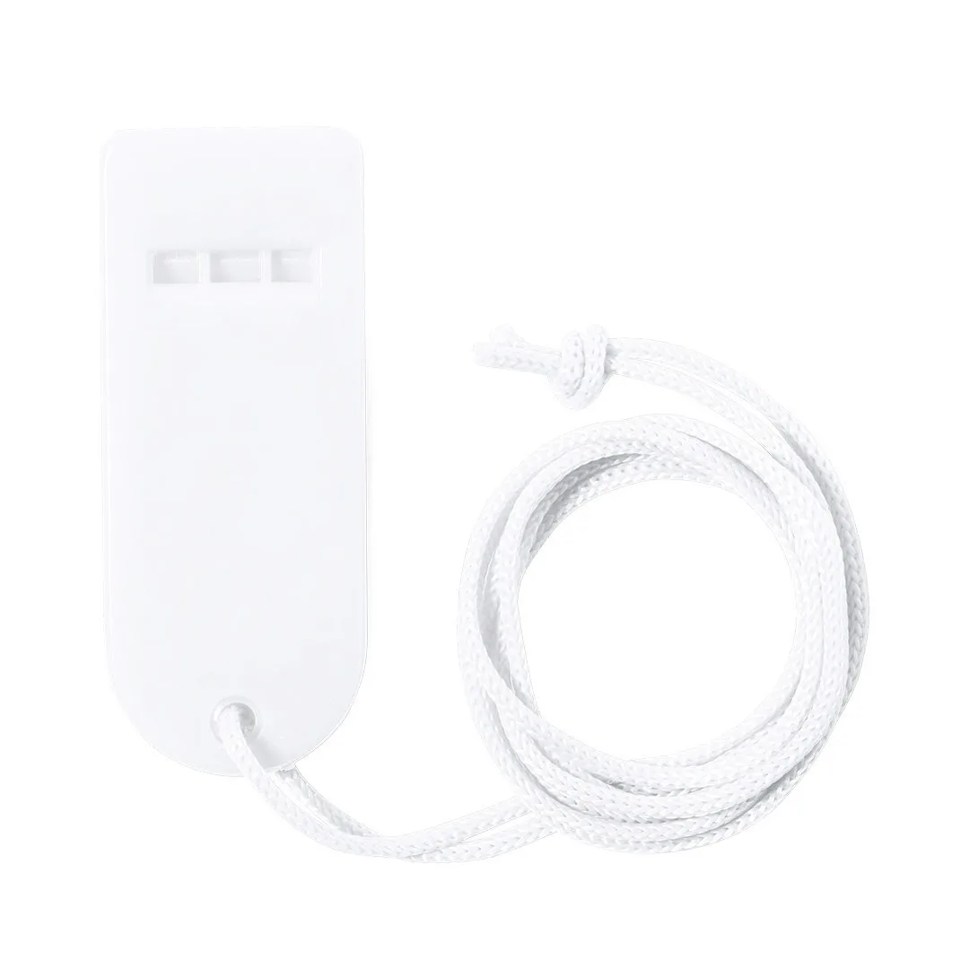 Apito de original design e feito em resistente PS. Com fita de pescoço a condizer e disponível numa vasta gama de cores.