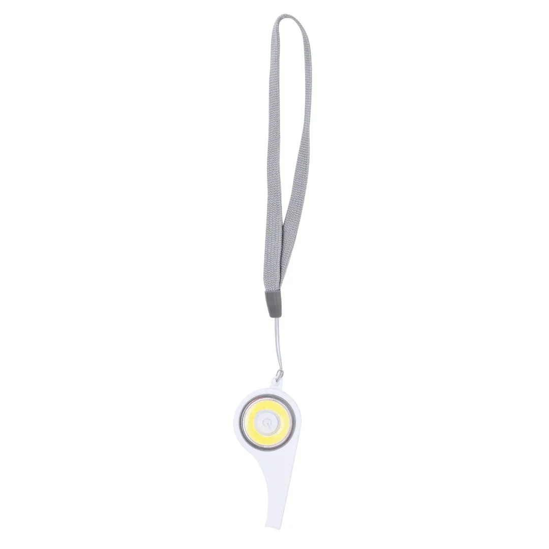 Ref: BEC18302MOEngenhoso apito multiusos com luz integrada no corpo. Fabricado em resistente ABS, com 6 luzes COB e várias posições de iluminação: fixa com dois níveis de intensidade e intermitente para uma maior visibilidade. Cordão para um cómodo transporte e é alimentado por uma pilha de botão (incluída). Apresentado em caixa de design kraft.