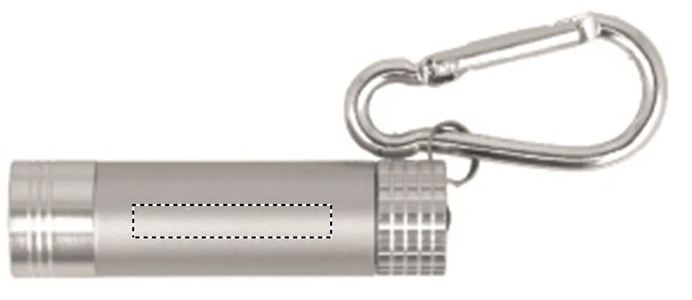 Lanterna LED de alumínio com mosquetão. A impressão laser permite iluminar o logotipo. Não apto para outras técnicas. Funciona com 3 pilhas LR44 incluídas.Porta-chaves LED alumínio/ABS