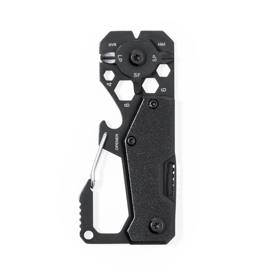 Ref: BEC18402MOExcelente multiferramenta fabricada em alumínio e aço inoxidável com acabamento na cor preta. Com 13 funções diferentes: chave para porcas sextavadas de diversos tamanhos, mosquetão, abridor de latas, régua, raspador, faca, chave de fenda plana e phillips. Apresentado em caixa de design kraft.