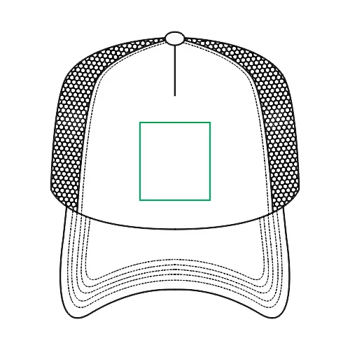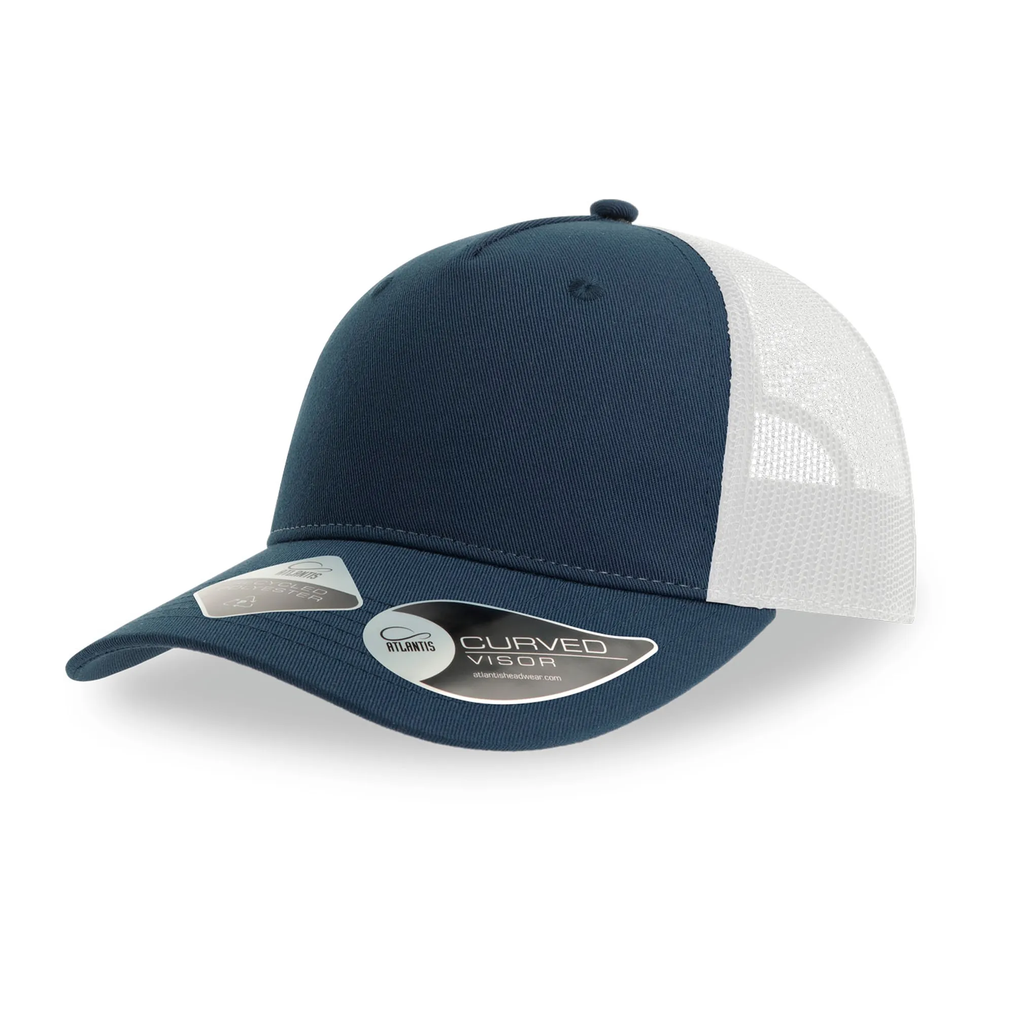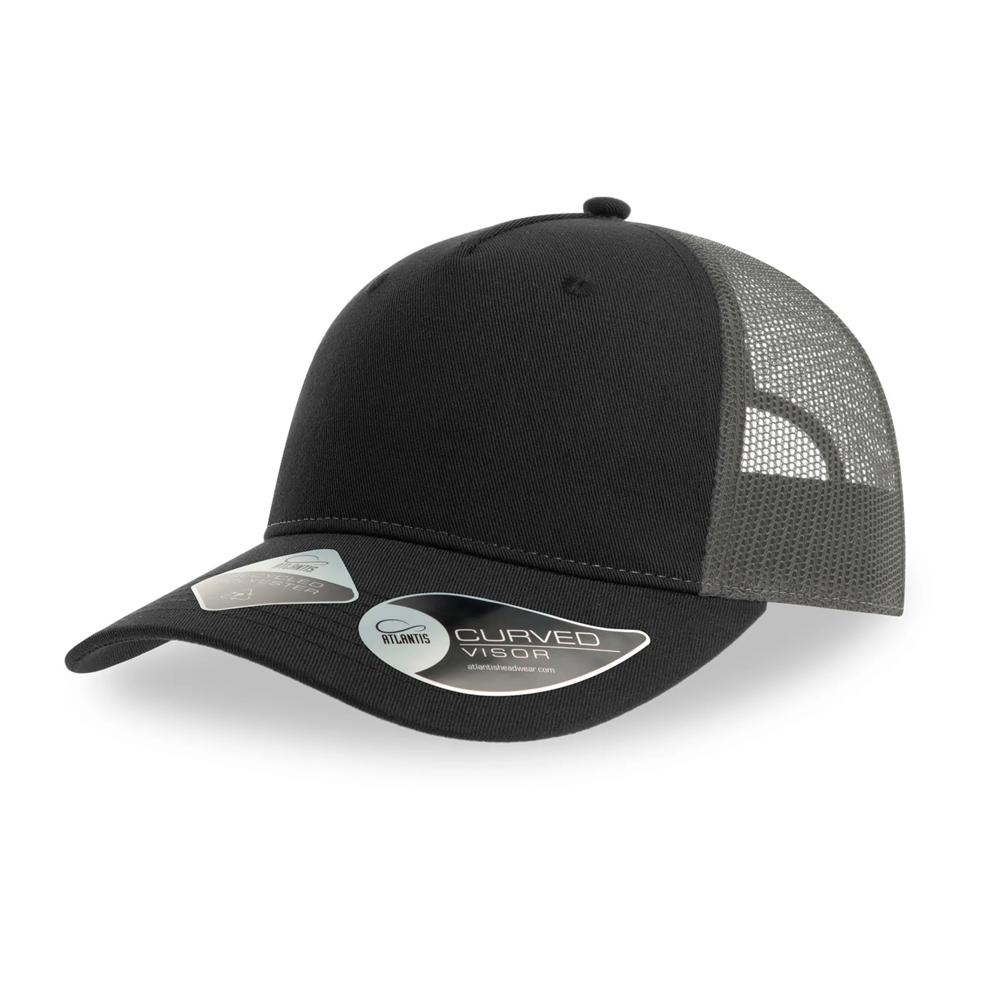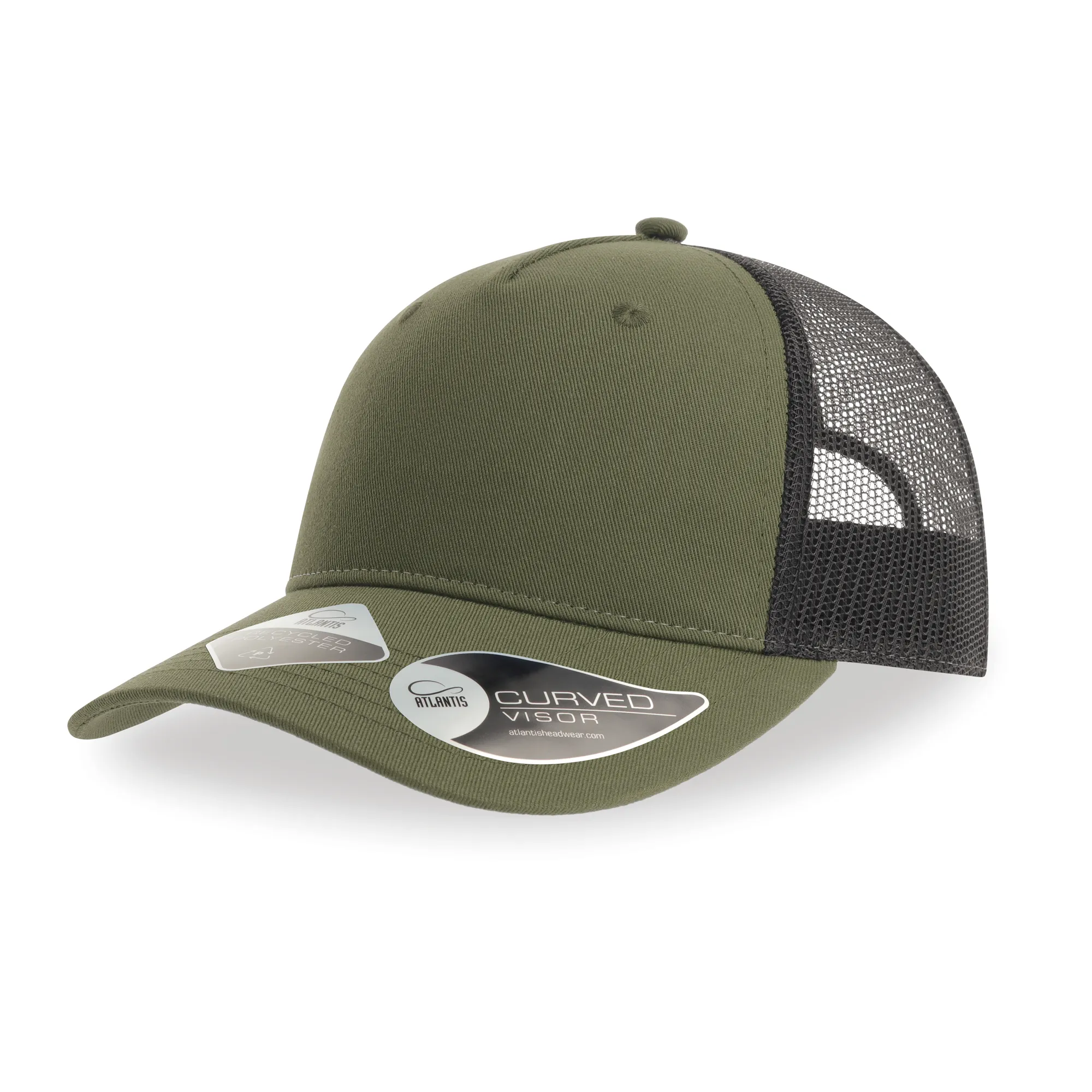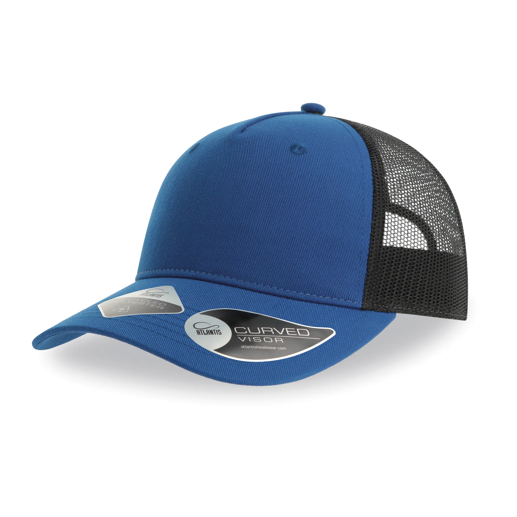 Boné trucker clássico, com 5 painéis, em Sarja de Poliéster reciclado. Malha traseira em poliéster reciclado e fecho traseiro em PVC reciclado. Parte frontal ampla, ideal para bordados e patches. 100% Poliéster reciclado certificado e fecho em PVC recicladoBoné Zion, 100% Poliéster reciclado