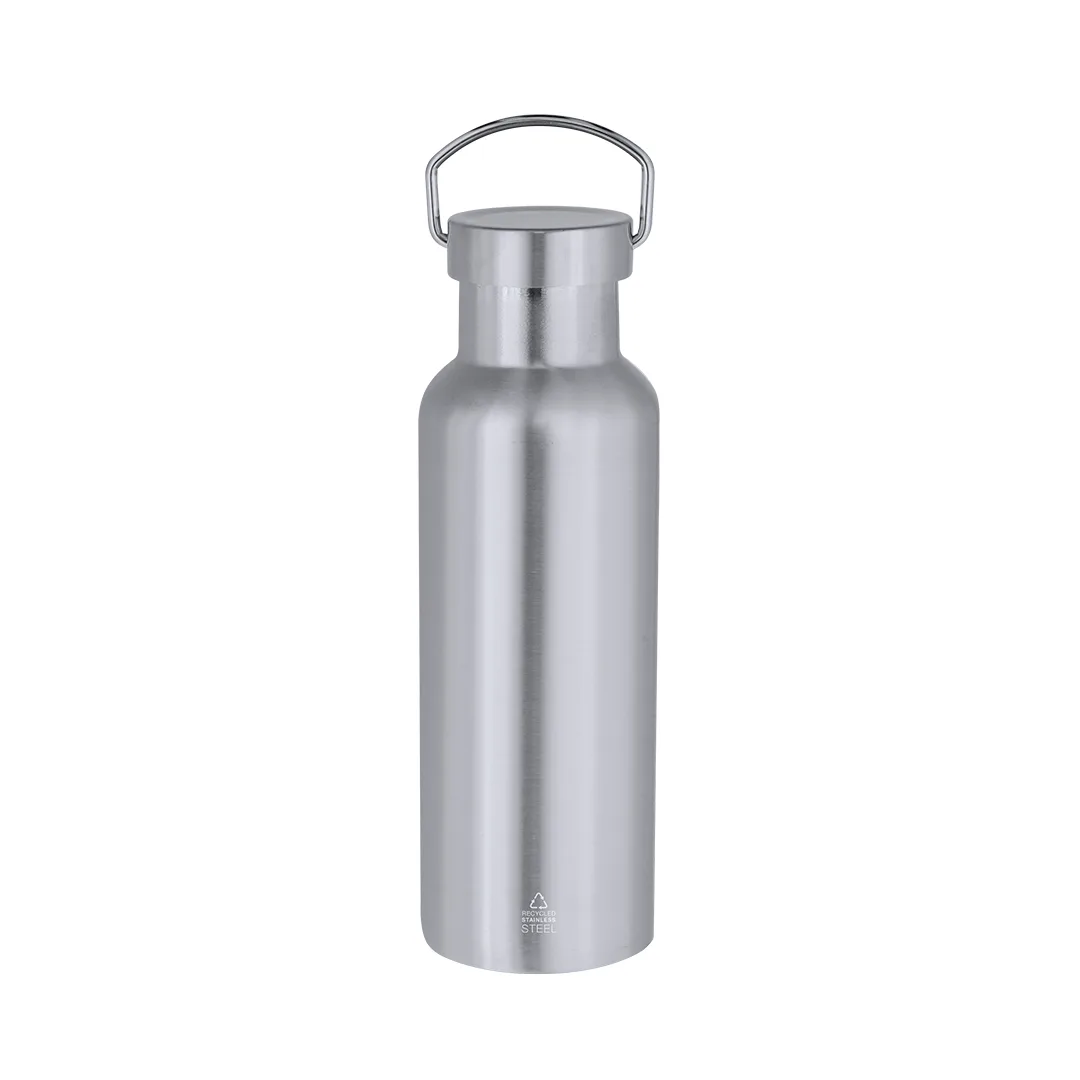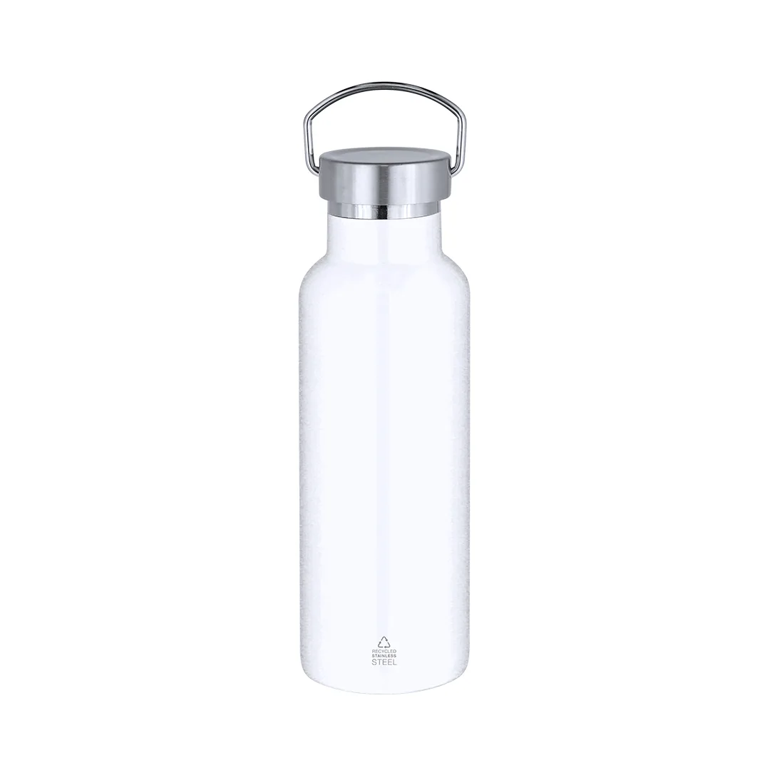 Garrafa térmica fabricada em Aço Inoxidável Reciclado de parede dupla com capacidade de 500 ml. Acabamento em cores vivas com efeito metalizado. Tampa de rosca equipada com asa de transporte. Inclui distintivo de aço inoxidável reciclado. O aço é um dos materiais mais procurados e pode ser encontrado praticamente em todo o lado, desde produtos de uso diário até grandes construções. Com inúmeras propriedades, destacando-se a durabilidade e o elevado grau de reutilização, torna-se uma alternativa muito valorizada em soluções de sustentabilidade. Quando devidamente tratado, permite obter novos recursos de utilização infinita.Aço Inox Reciclado500 ml
