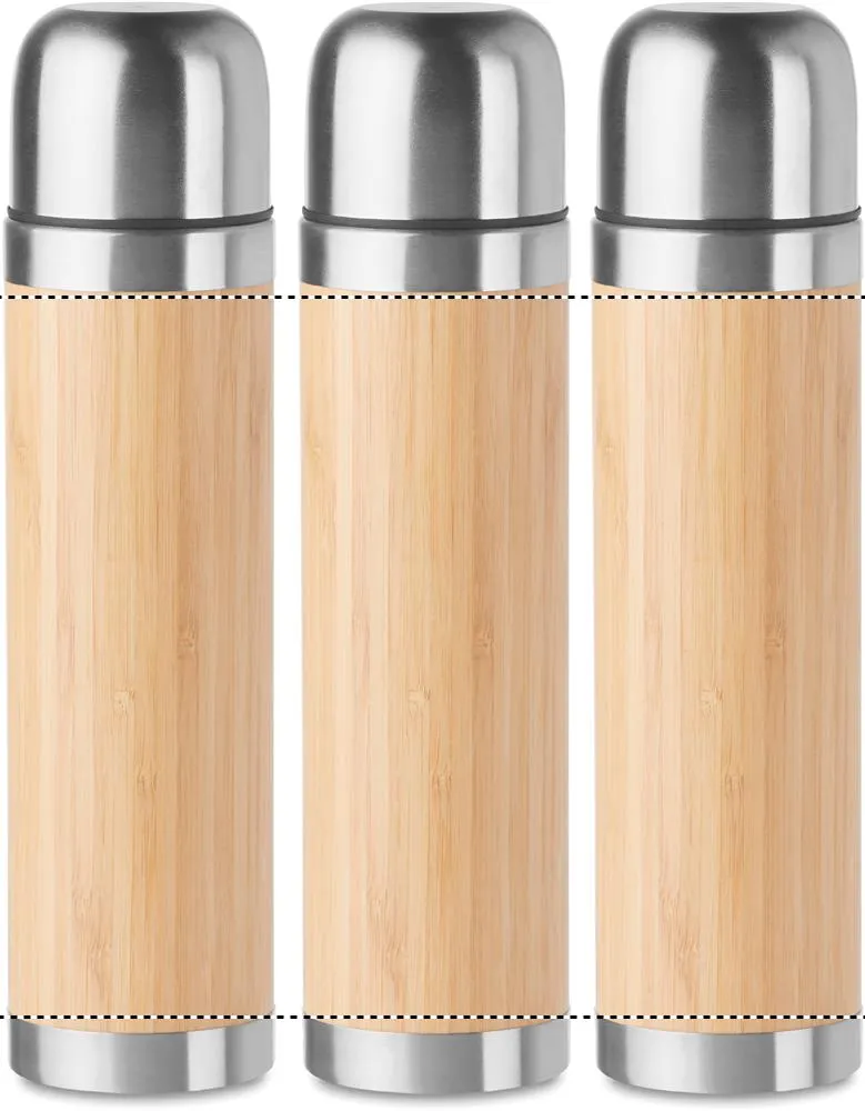 Termo em aço inoxidável de parede dupla com tampa de bambu. Capacidade 400 ml. O bambu é um material natural, a cor do item, o tamanho e a impressão podem variar. Anti vazamento.Termo revestimento em bambu