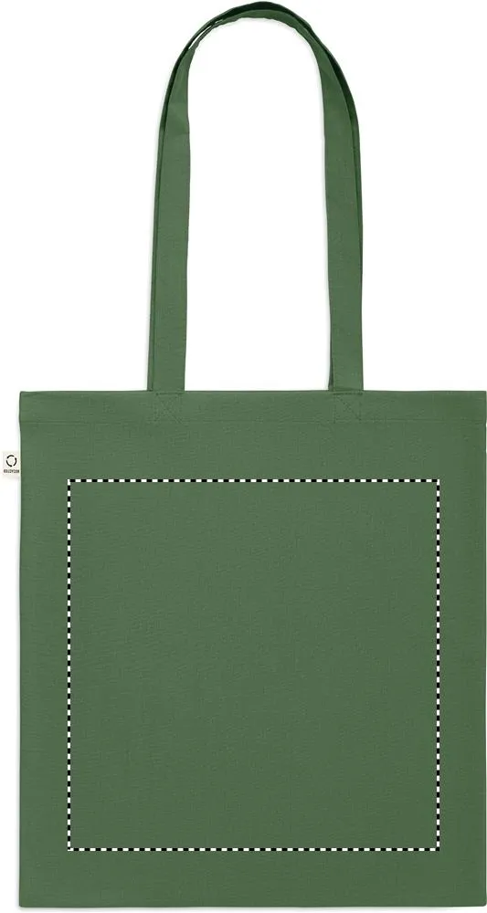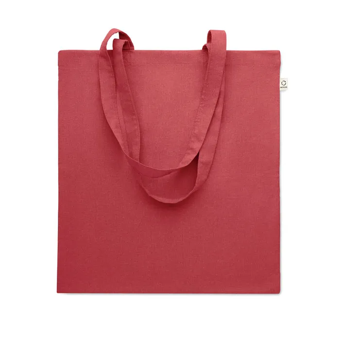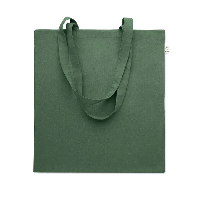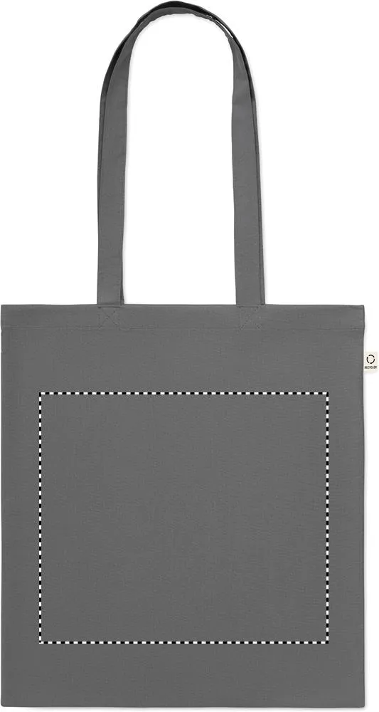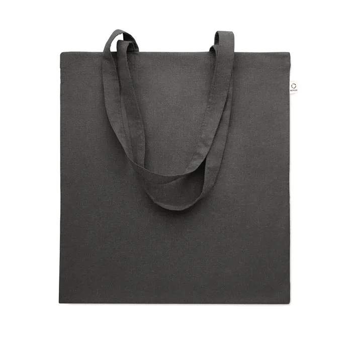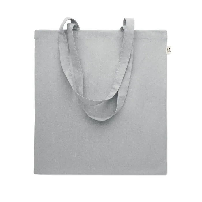 Saco de compras em algodão reciclado pre--consumo (70% algodão reciclado e 30% RPET) com alças longas. 140 gr/m². Este item pode encolher após a impressão.Saco compras algodão reciclado