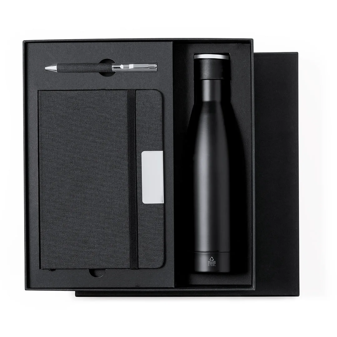 Elegante set premium que inclui: Termo de dupla camada em Aço Inoxidável Reciclado de acabamento preto mate e de 500 ml de capacidade con asa rígida de metal cor prata mate. Com logotipo aço inoxidável.Bloco de notas em RPET em elegante cor preta, com detalhe metálico especial para gravação a laser. Inclui fecho elástico y marca-páginas de tecido. Interior com 80 folhas pautadas. Com logotipo RPET.Esferográfica em RPET de acabamento preto mate, de mecanismo giratório e tinta azul. Com clip e ponteira em metal polido. Set apresentado num estojo individual de acabamento mate, com recorte interior para cada um dos elementos do set.O material RPET é elaborado a partir de plástico reciclado, para assim fomentar a reutilização de resíduos plásticos e ajudar à sustentabilidade do planeta.Garrafa Térmica Aço Inox Reciclado, 500 ml. Bloco Poliéster 300D RPET, Capa Rígida, 80 Folhas. Esferográfica Poliéster 300D RPET Incluída