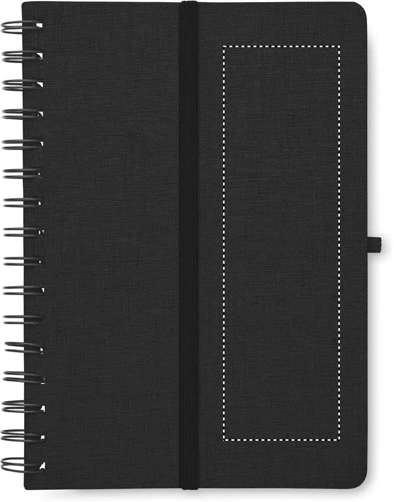 Bloco de notas A5 com capa rígida 600D RPET com função de suporte para smartphone. Fio duplo. 160 páginas pautadas (80 folhas). papel reciclado de 70 g/m². Fecho elástico.Bloco de notas A5 com suporte