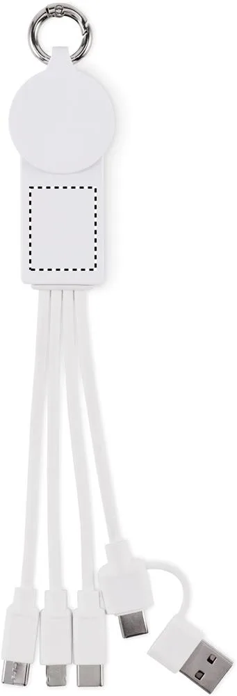 Porta-chaves com cabo de carregamento com entrada: 2 em 1 tipo C e tipo A. Saída: Carregamento de relógio (Samsung® e Apple®), 2 x tipo C e micro-B (2 em 1 pino). Cabo fabricado em TPE reciclado.Cabo carregamento 2 em 1 tipoC