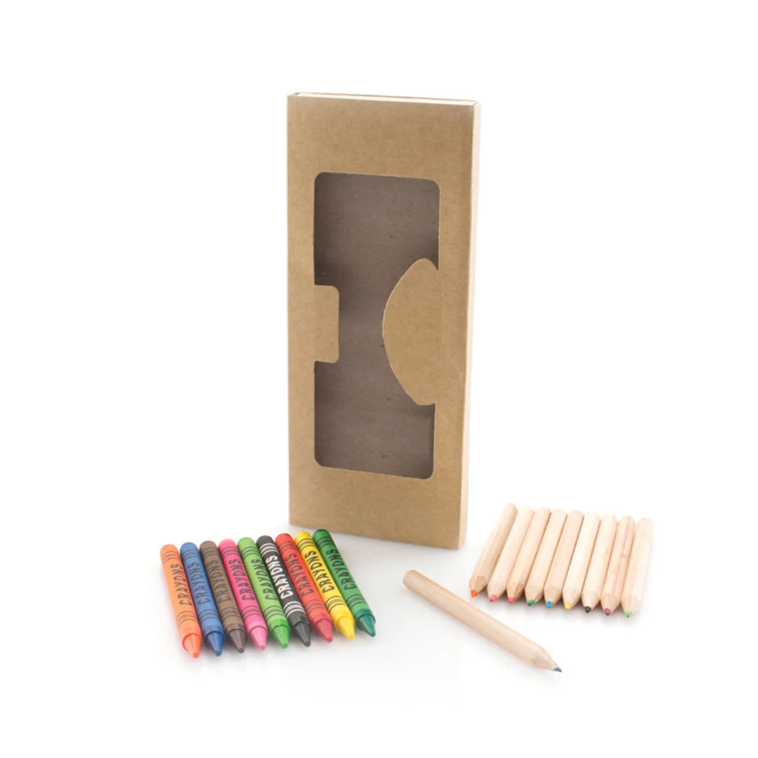 Conjunto de 19 peças em estojo de papelão natural com janela e bandeja interna. Contém giz de cera cilíndrico e lápis de madeira natural do corpo hexagonal em cores variadas.Cartão Reciclado19 Peças