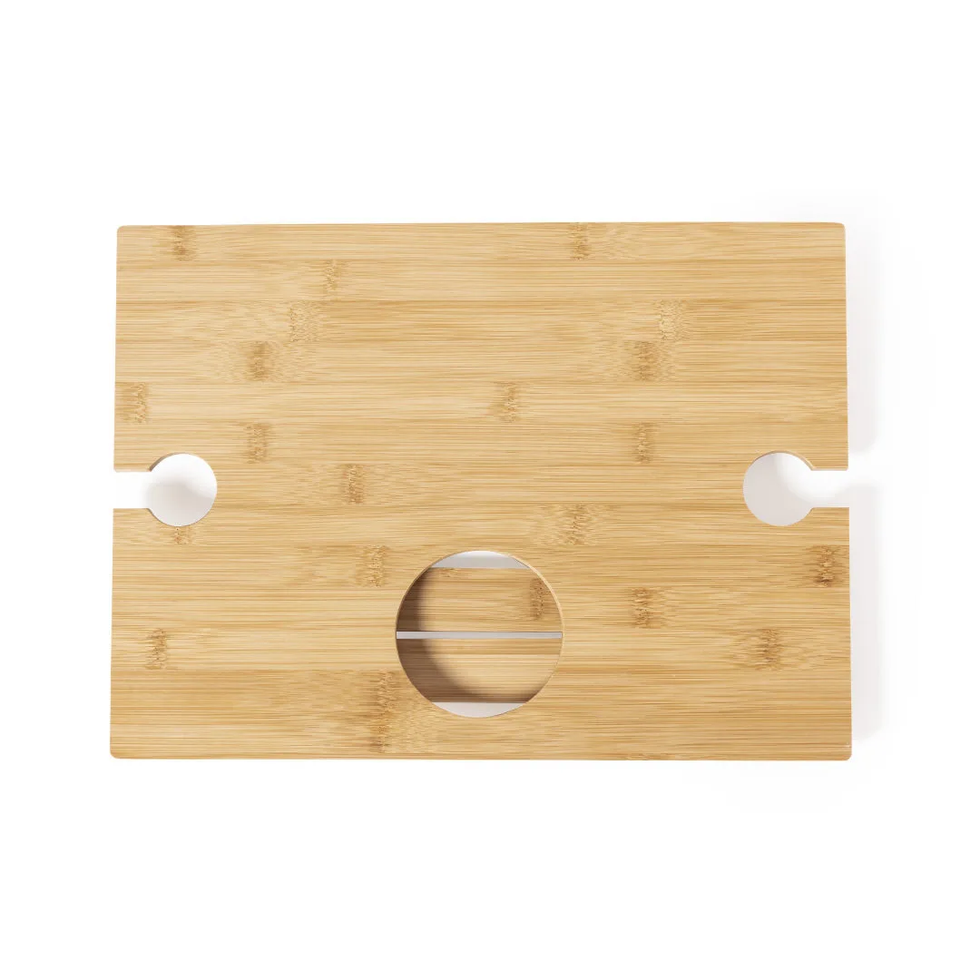 Mesa dobrável para os aficionados do mundo do vinho. Fabricada em bambu, inclui compartimento para garrafa de 75cl e 2 suportes para copos. De fácil dobragem e tamanho compacto, apresentada numa atrativa caixa individual de design eco.BambuDobrável