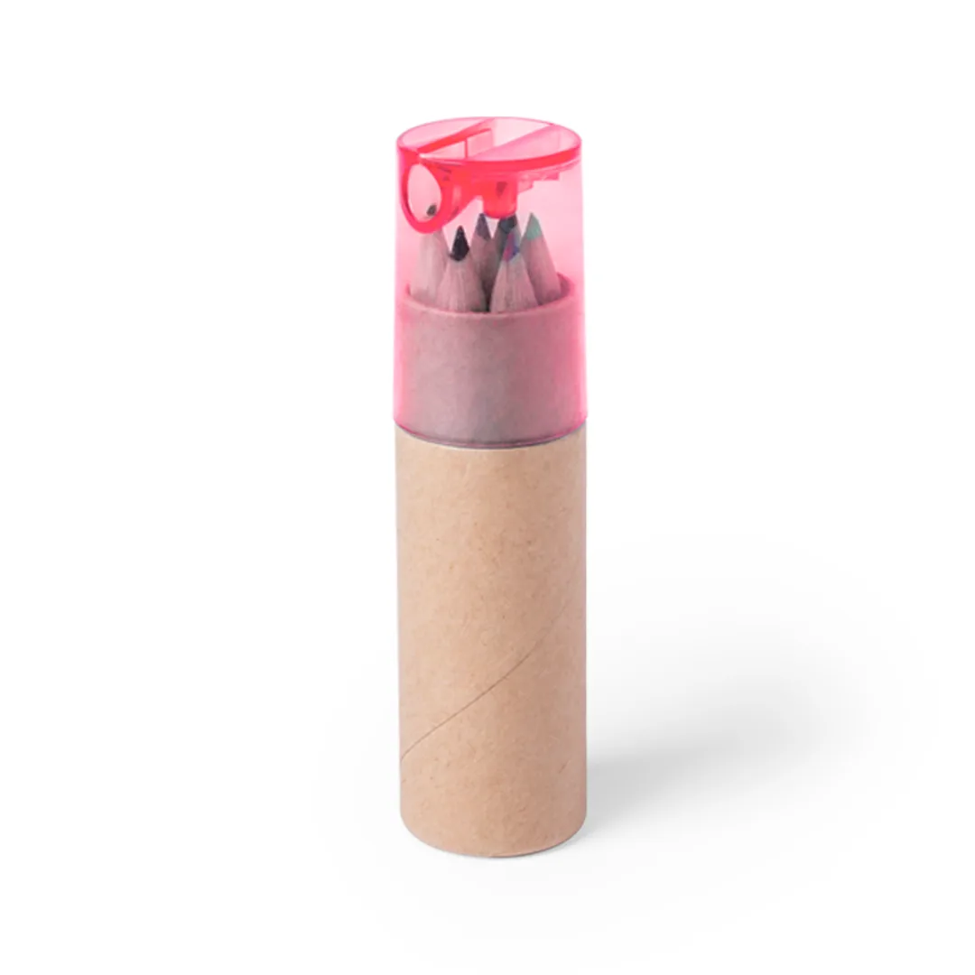 Ref: BEC2619MOConjunto de 7 peças em estojo com corpo em cartão natural e capuz transparente em várias cores. Inclui 6 lápis de madeira com um corpo hexagonal com acabamento natural e um apontador integrado na tampa.