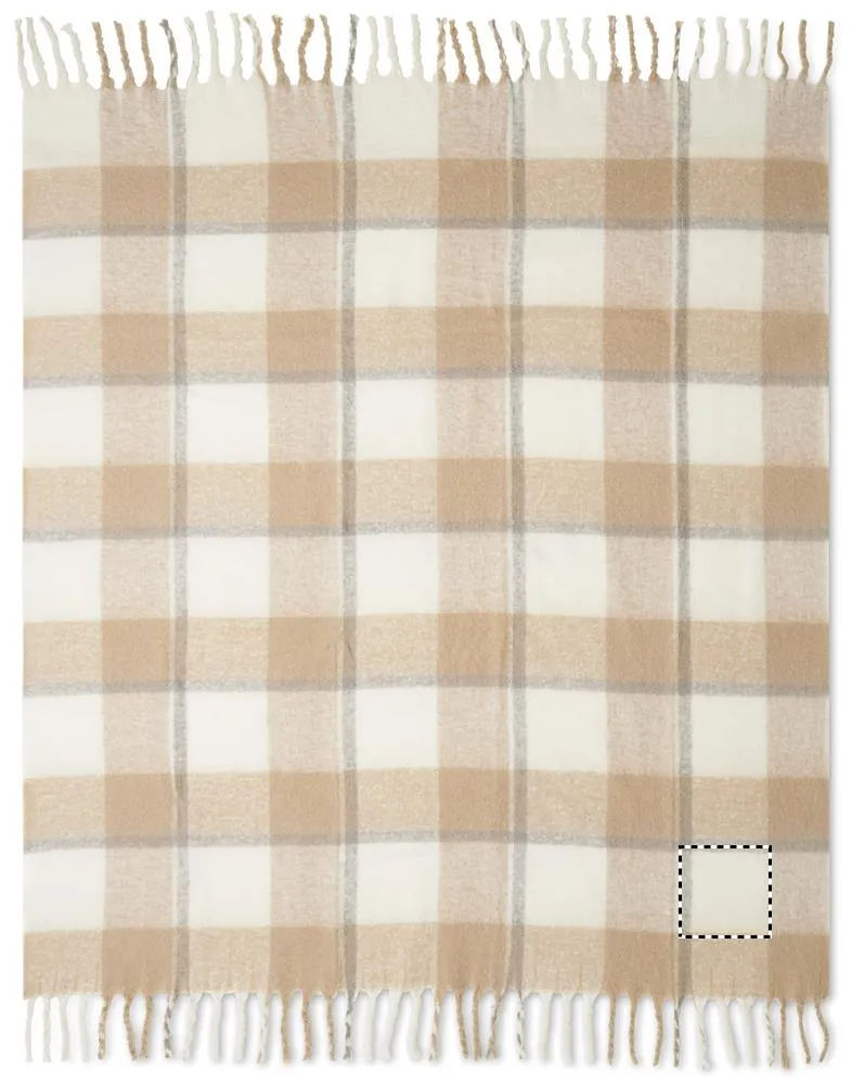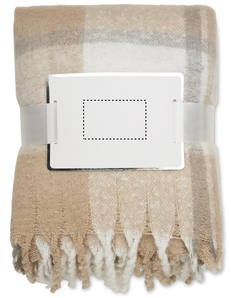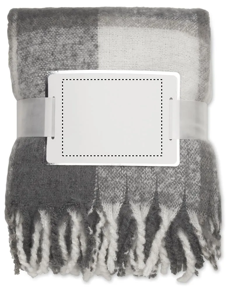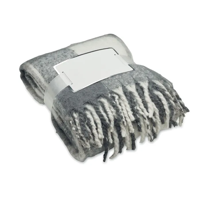 Manta de RPET poliéster mohair com design axadrezado e franjas enroladas à mão. Embrulhada em fita e cartão para impressão.Manta de mohair axadrezada