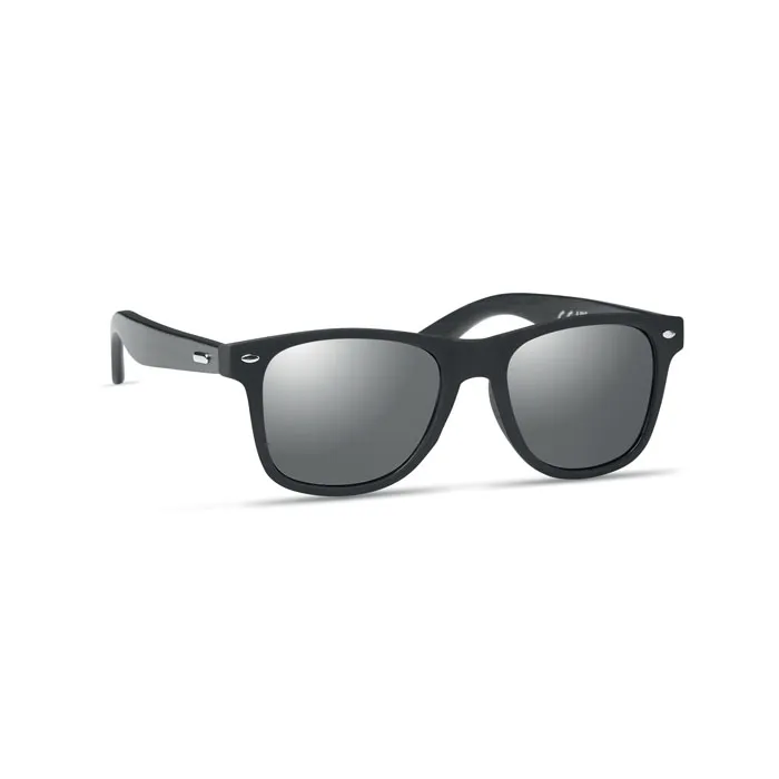 Óculos de sol com armação de bambu revestidos a preto e em toda a lente espelhada. Protecção UV400. O bambu é um material natural, a cor do item, o tamanho e a impressão podem variar.Óculos sol com armação bambu