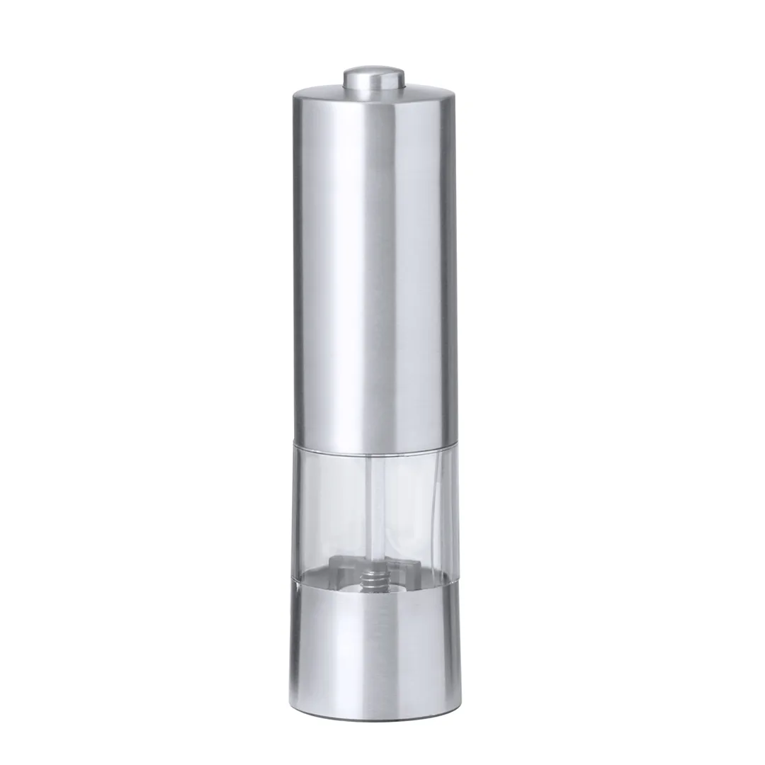 Moinho elétrico para sal e pimenta em aço inoxidável. Ideal para adicionar a especiaria mais desejada no compartimento de 70 ml, temperar premindo no botão superior podendo ajustar o tamanho do grão. Equipado com uma janela para visualizar a quantidade de especiarias que contém e com luz LED. Alimentado por 4 pilhas AAA (não incluídas) e apresentada numa caixa de design kraft.Aço Inox1 Led. Moedor Regulável. 4 Pilhas AAA Não Incluídas