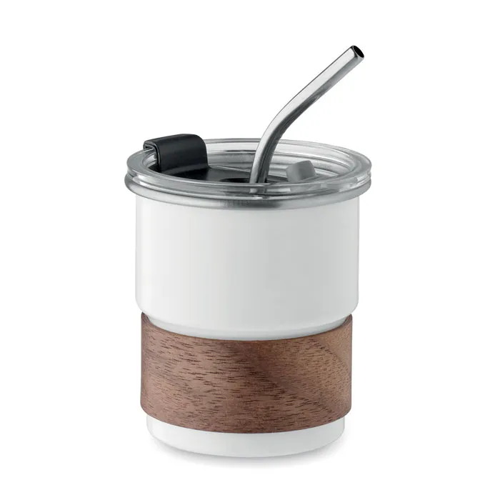 Copo de parede simples em aço inoxidável reciclado (90% aço inoxidável reciclado e 10% aço inoxidável) com pega amovível em madeira de acácia e palhinha em aço inoxidável. Tampa de abrir. À prova de fugas. Capacidade: 260 ml. Como copo de parede única, pode ocorrer transferência de calor.Copo de parede simples 260 ml